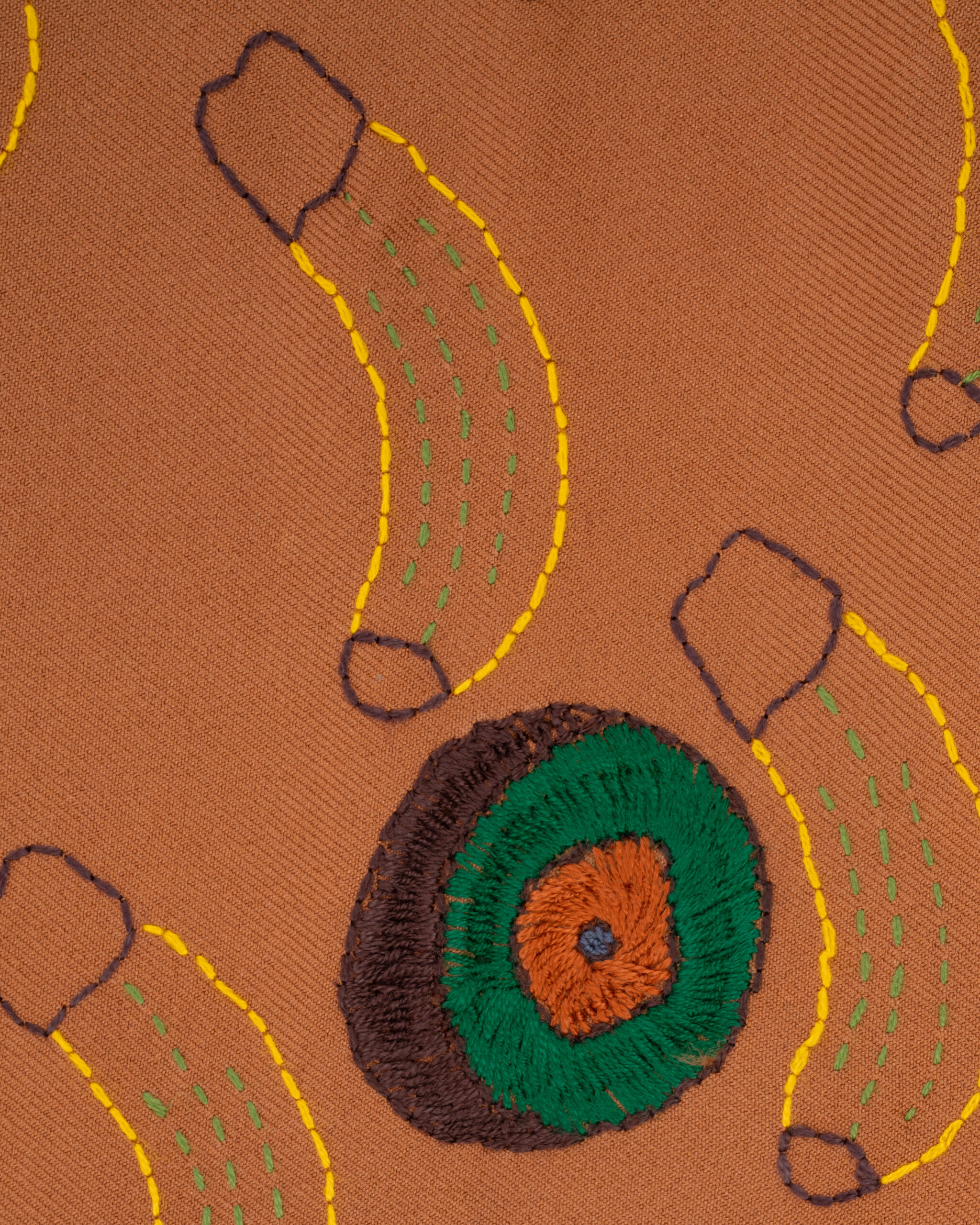 The Fruit Canvas Trouser reinterprets workwear through playful, hand-crafted detail. Made from sturdy brown canvas, the trousers are covered in hand-embroidered fruit motifs — looping yellow bananas, bright red strawberries, and a single green kiwi — arranged in rhythmic clusters across the legs. Each motif is individually stitched, lending a sense of movement and charm that offsets the structured shape.