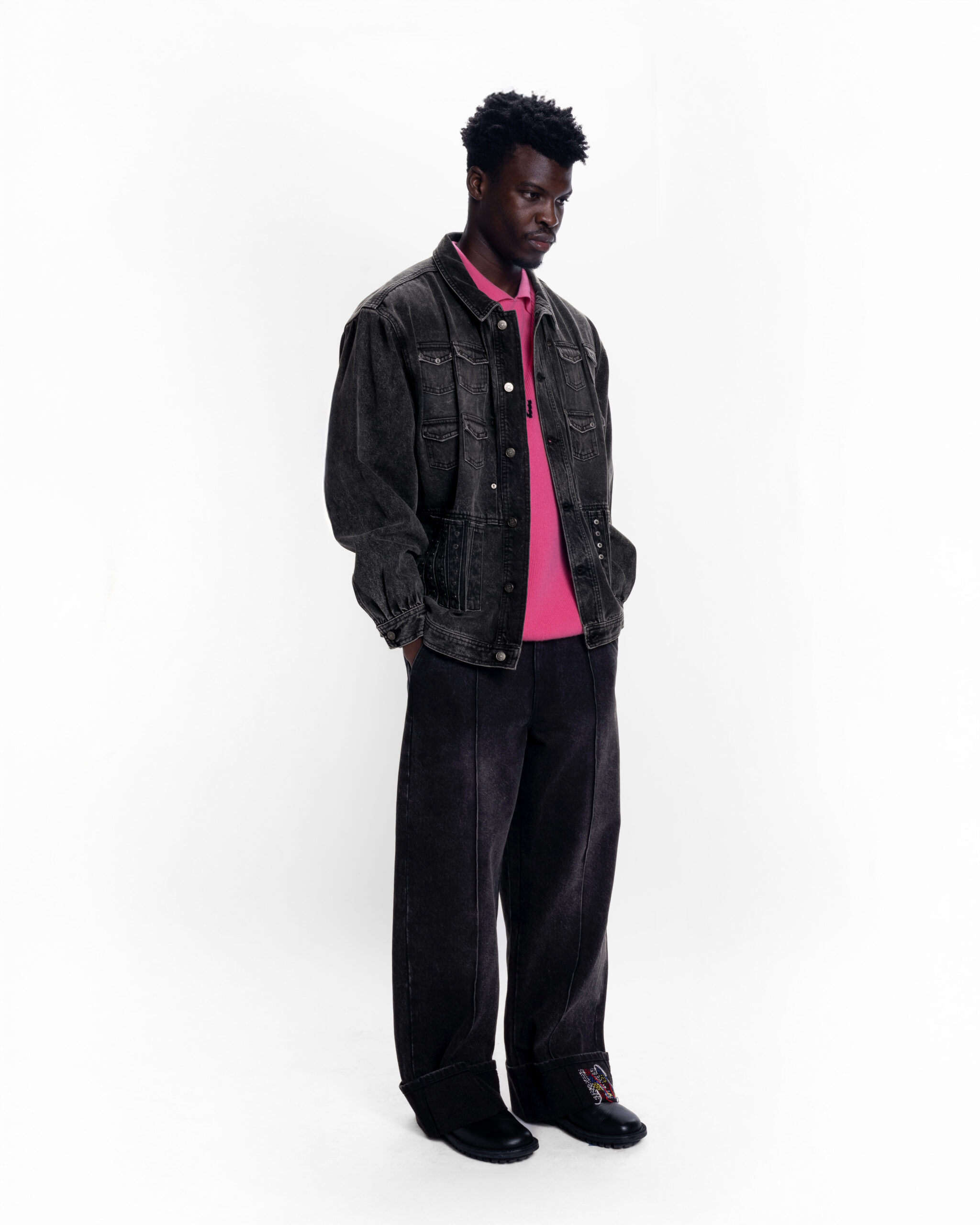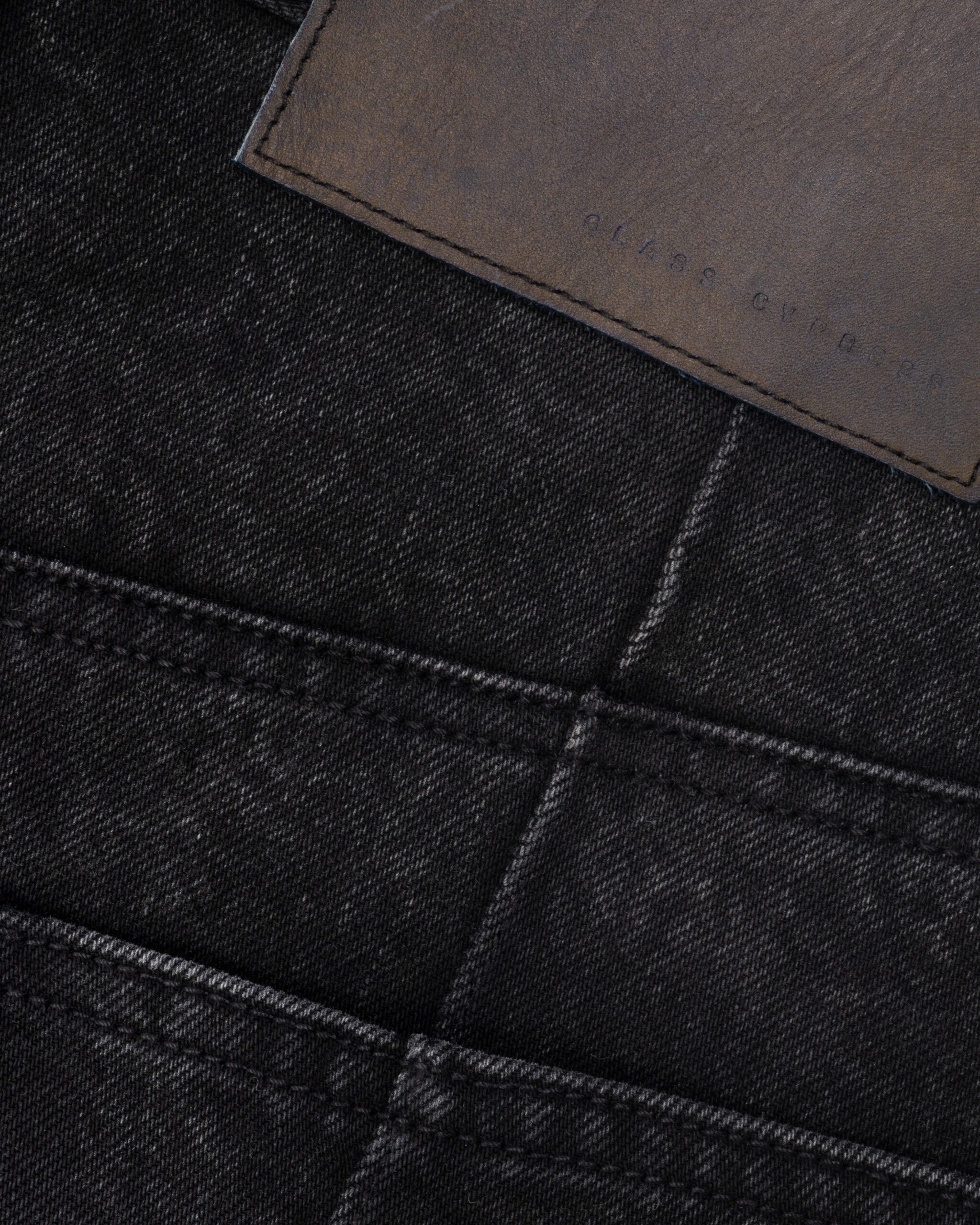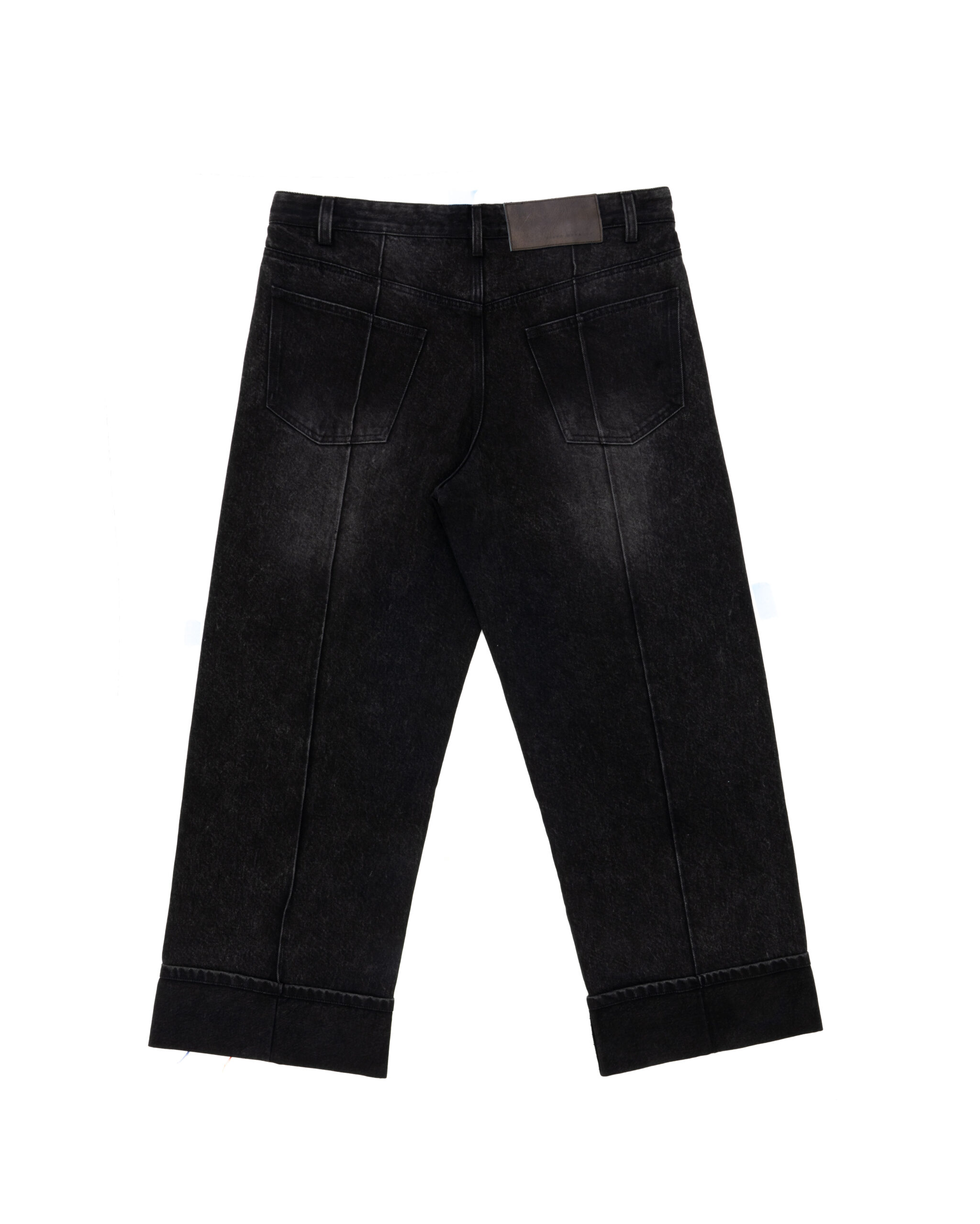 The Black High Waisted Denim offers a refined reinterpretation of a classic silhouette through proportion and surface treatment. Crafted in washed black denim, the style features front pintuck seams that sharpen the leg line and emphasize structure. The cropped length and wide cuff introduce a grounded visual weight, balanced by a subtle pop of hand-stitched embroidery near the hem—an understated mark of individuality.