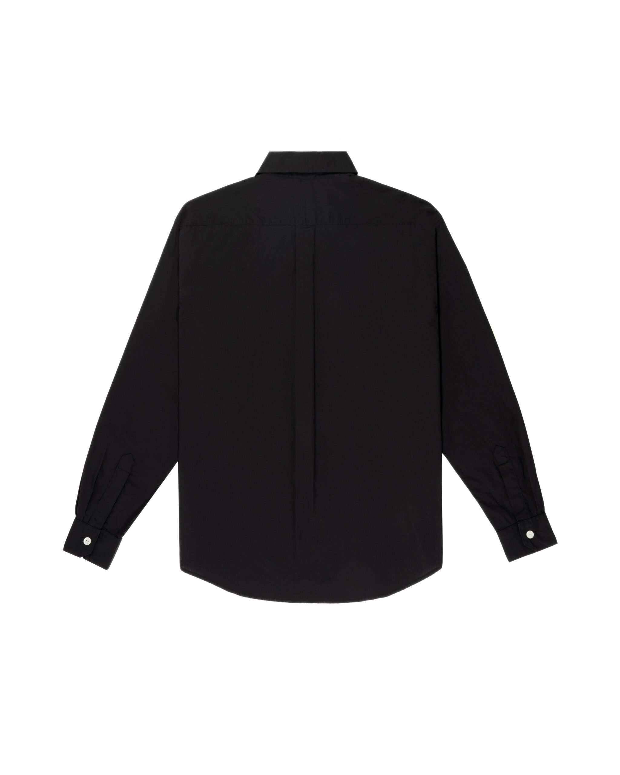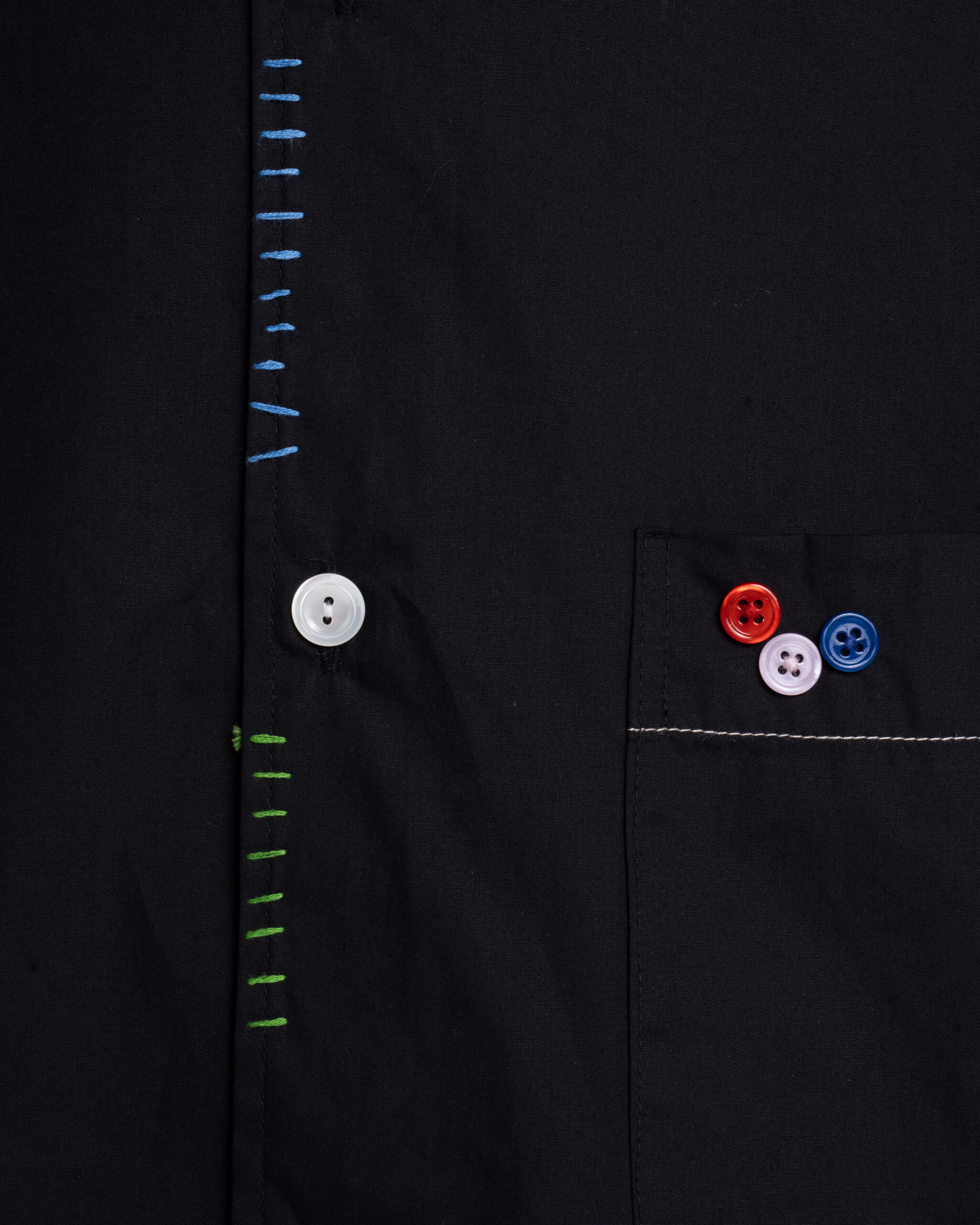 LONG-SLEEVE BUTTON-DOWN SHIRT CUT FROM PURE COTTON IN BLACK. FEATURing MULTI-COLOR HAND-STITCHED EMBROIDERY ALONG THE PLACKET, COLLAR, AND HEMLINE, CREATING SUBTLE ACCENTS AGAINST THE MONOCHROME GROUND. A SINGLE PATCH POCKET AT THE LOWER FRONT INCLUDES ADDITIONAL STITCH DETAILING AND EXTRA BUTTONS FOR FUNCTION AND DESIGN.
