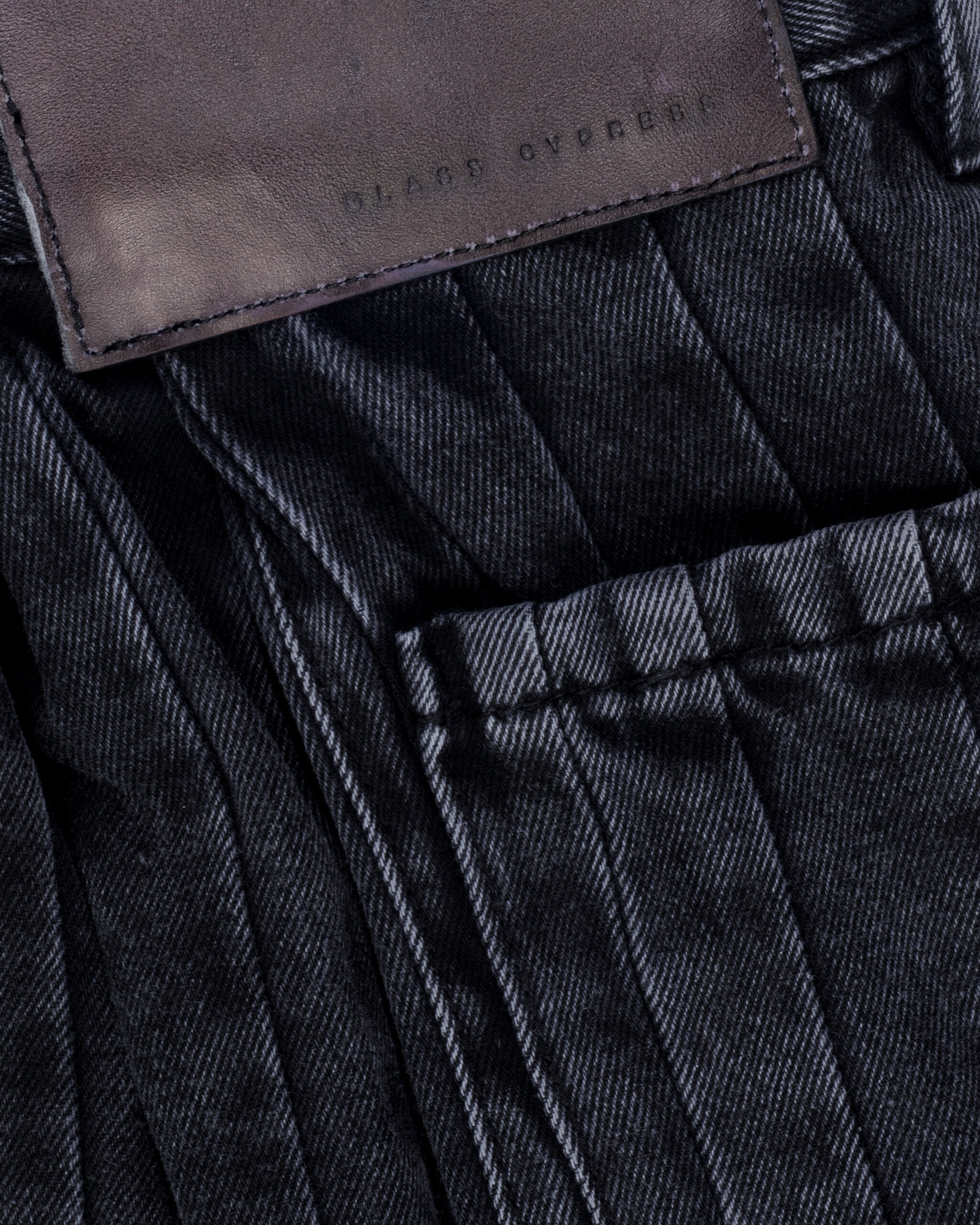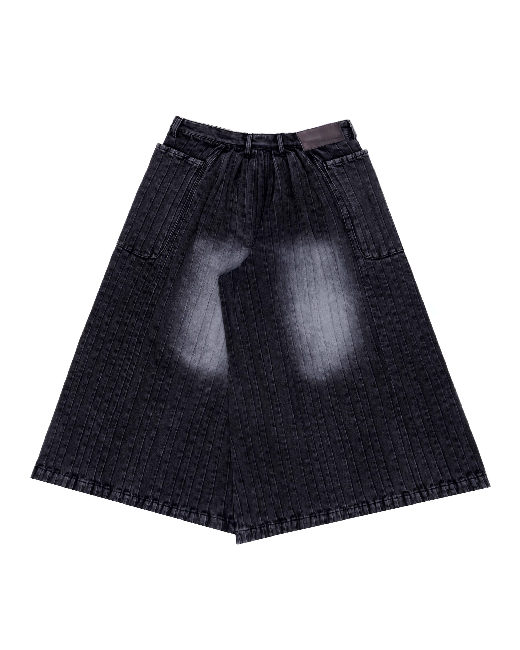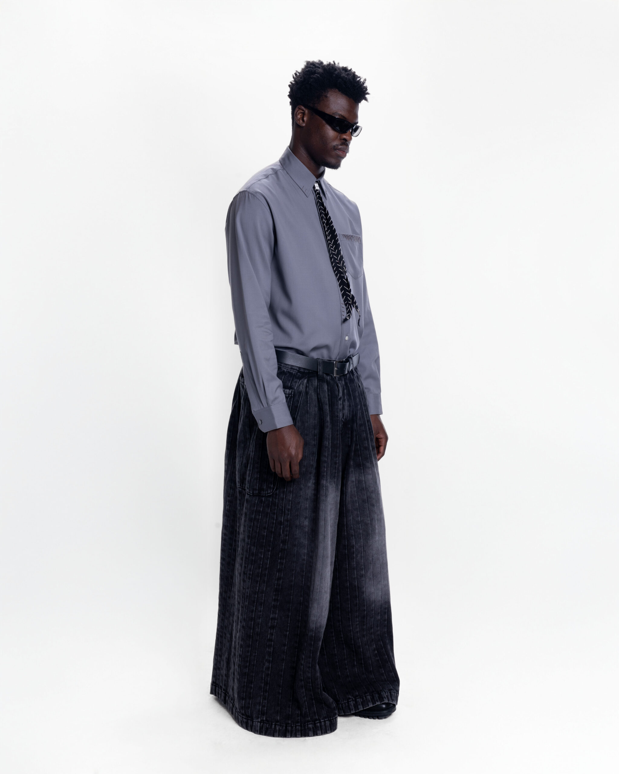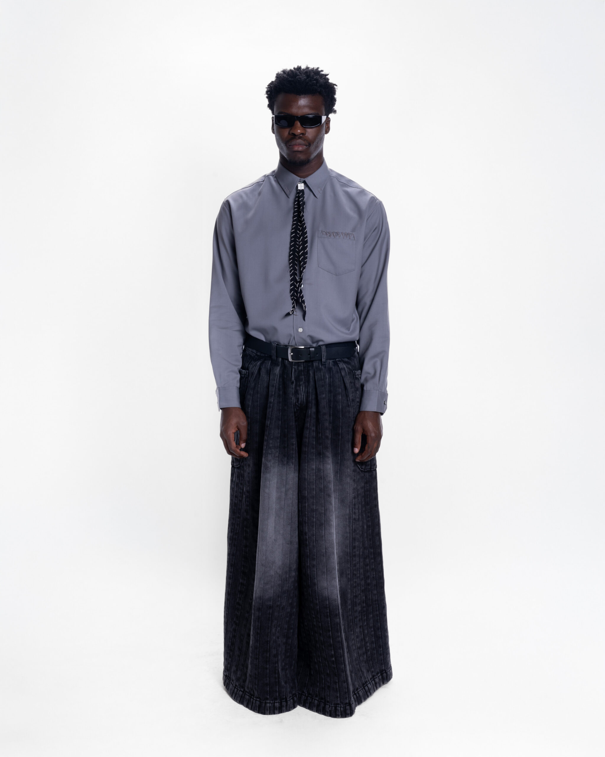 WIDE-LEG DENIM TROUSERS CONSTRUCTED FROM HAND-ASSEMBLED PANELS OF WASHED BLACK DENIM. FEATURES A DISTINCT PIN-TUCK EFFECT CREATED BY HAND-EMBROIDERED VERTICAL STITCH LINES RUNNING THROUGHOUT THE BODY. DESIGNED WITH A RELAXED HIGH RISE AND EXTENDED HEM FOR A STRAIGHT, ARCHITECTURAL DRAPE. EACH PAIR UNDERGOES INDIVIDUAL WASH TREATMENT TO CREATE A UNIQUE FADED PATTERN ACROSS THE FRONT AND BACK.