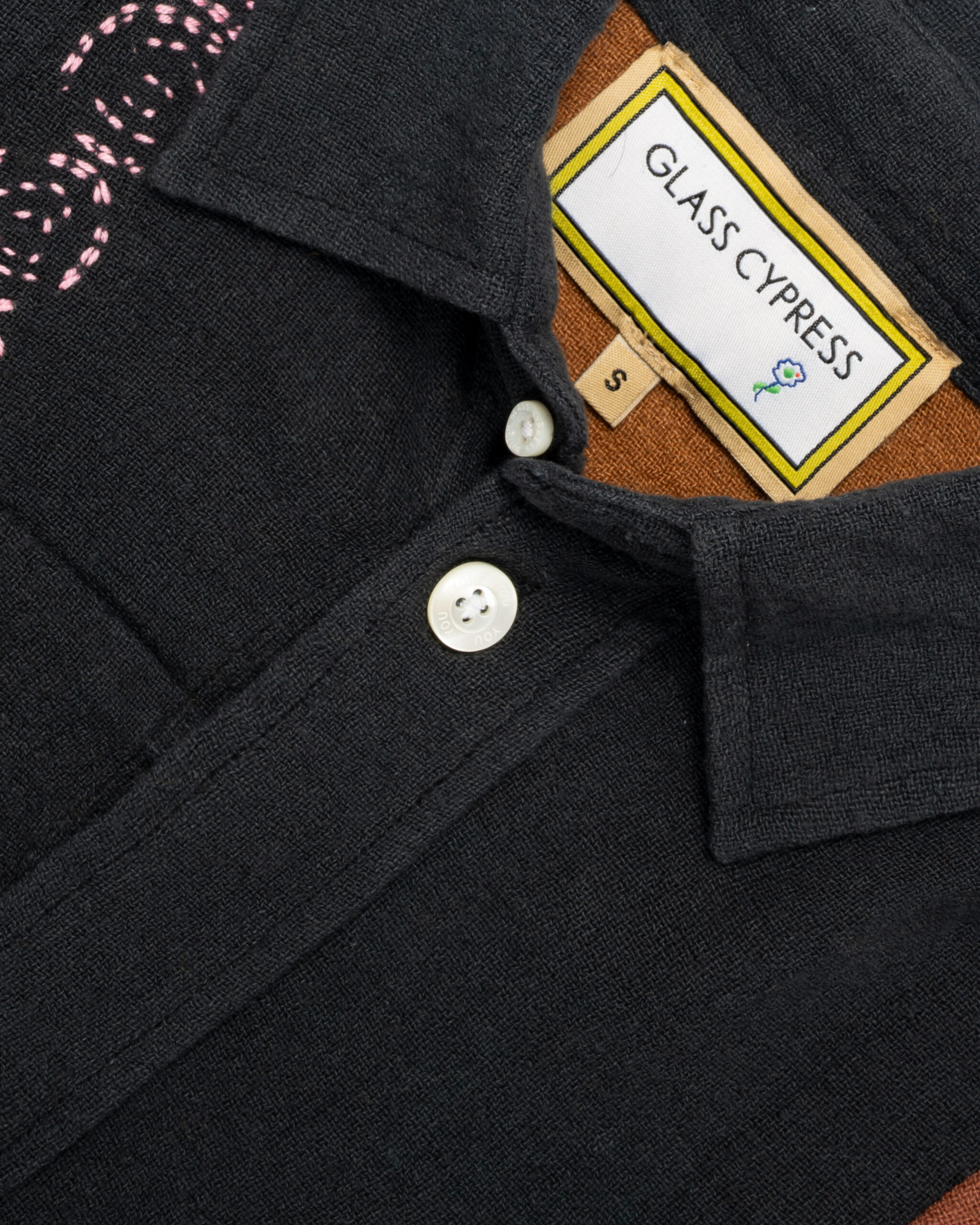 Long sleeve button-down shirt in a multicolor patchwork composition. Each panel is uniquely placed, creating a one-of-a-kind garment that highlights artisanal reconstruction. Lightweight and airy, the gauze offers year-round versatility—ideal for layering or standalone wear in varying climates.