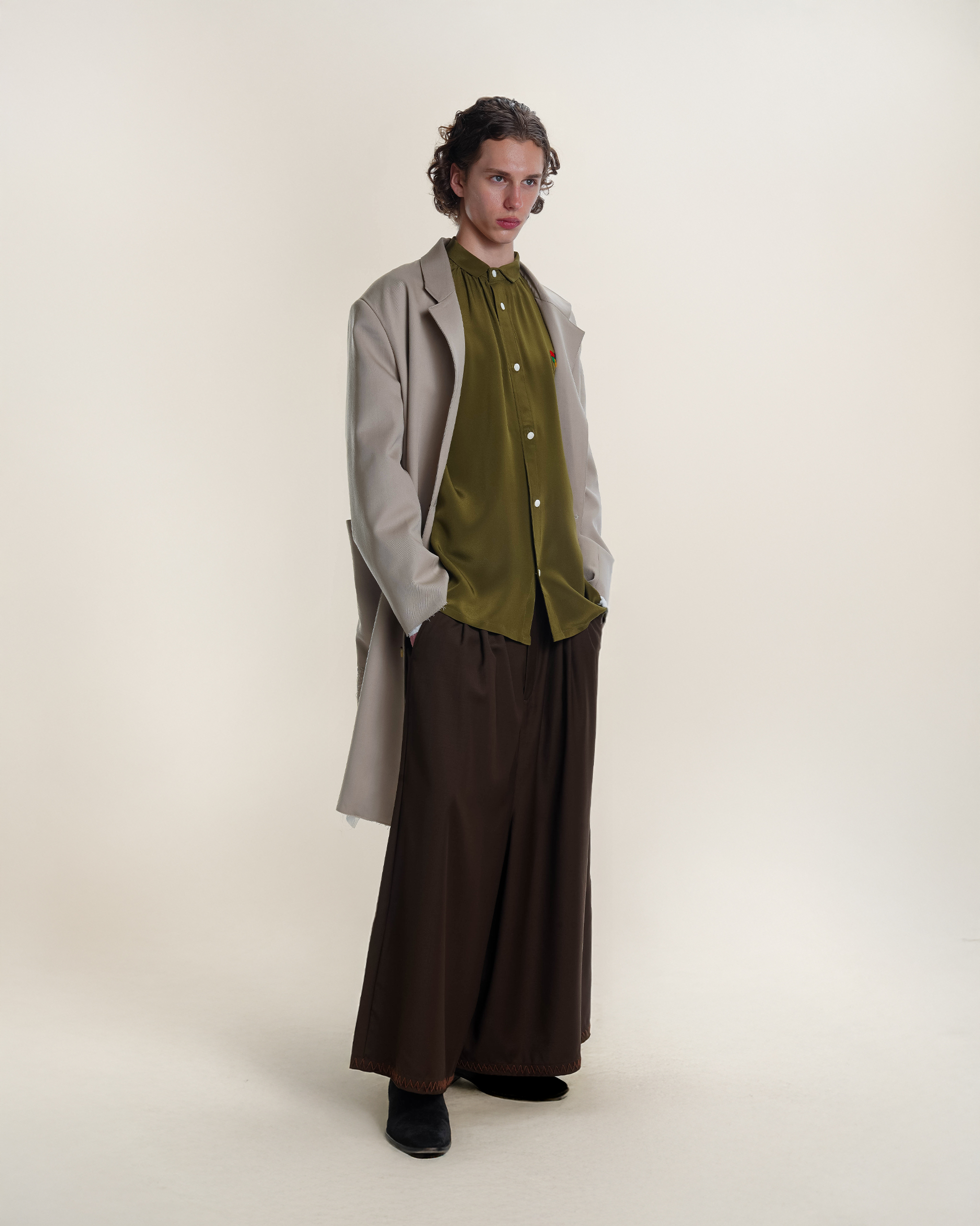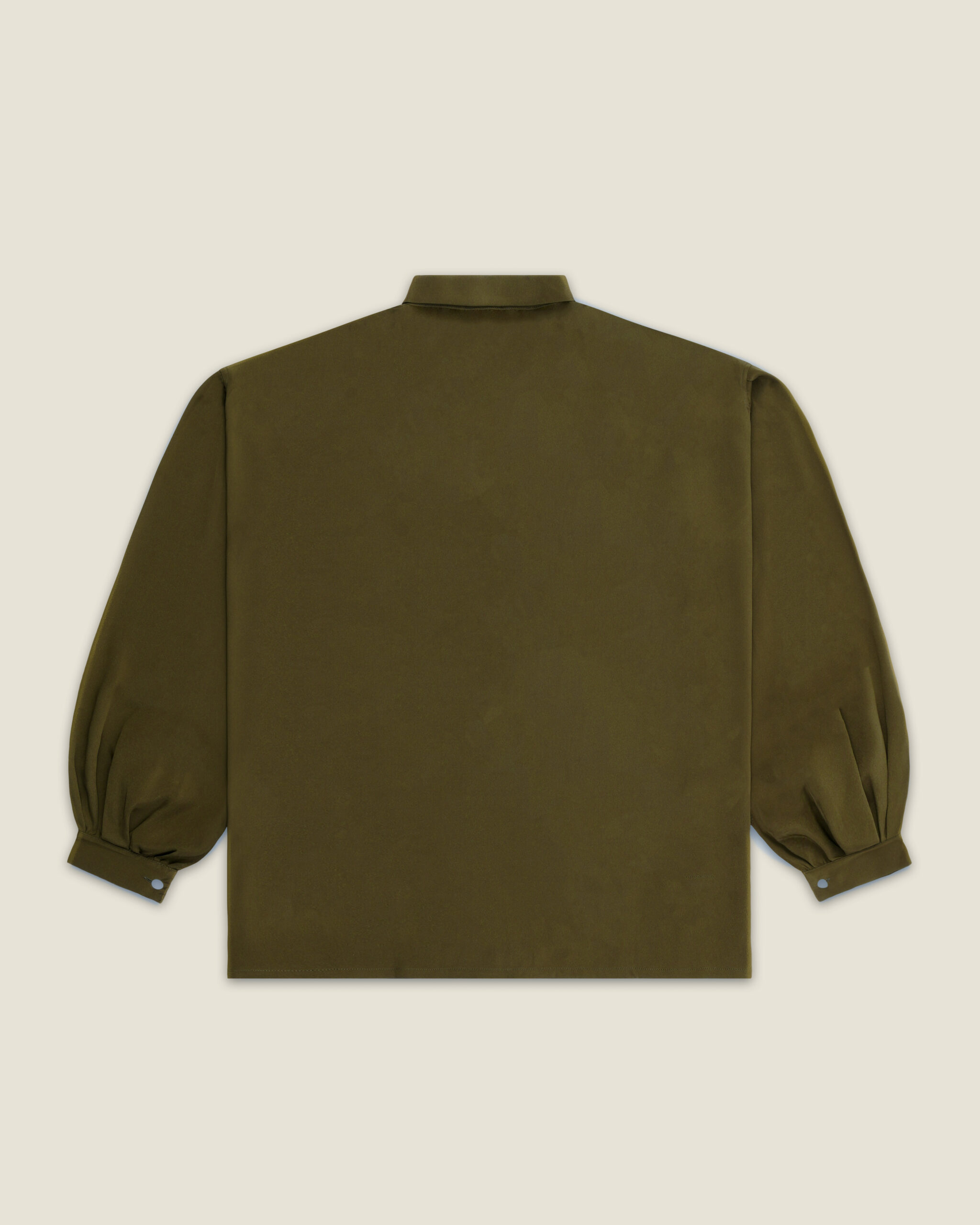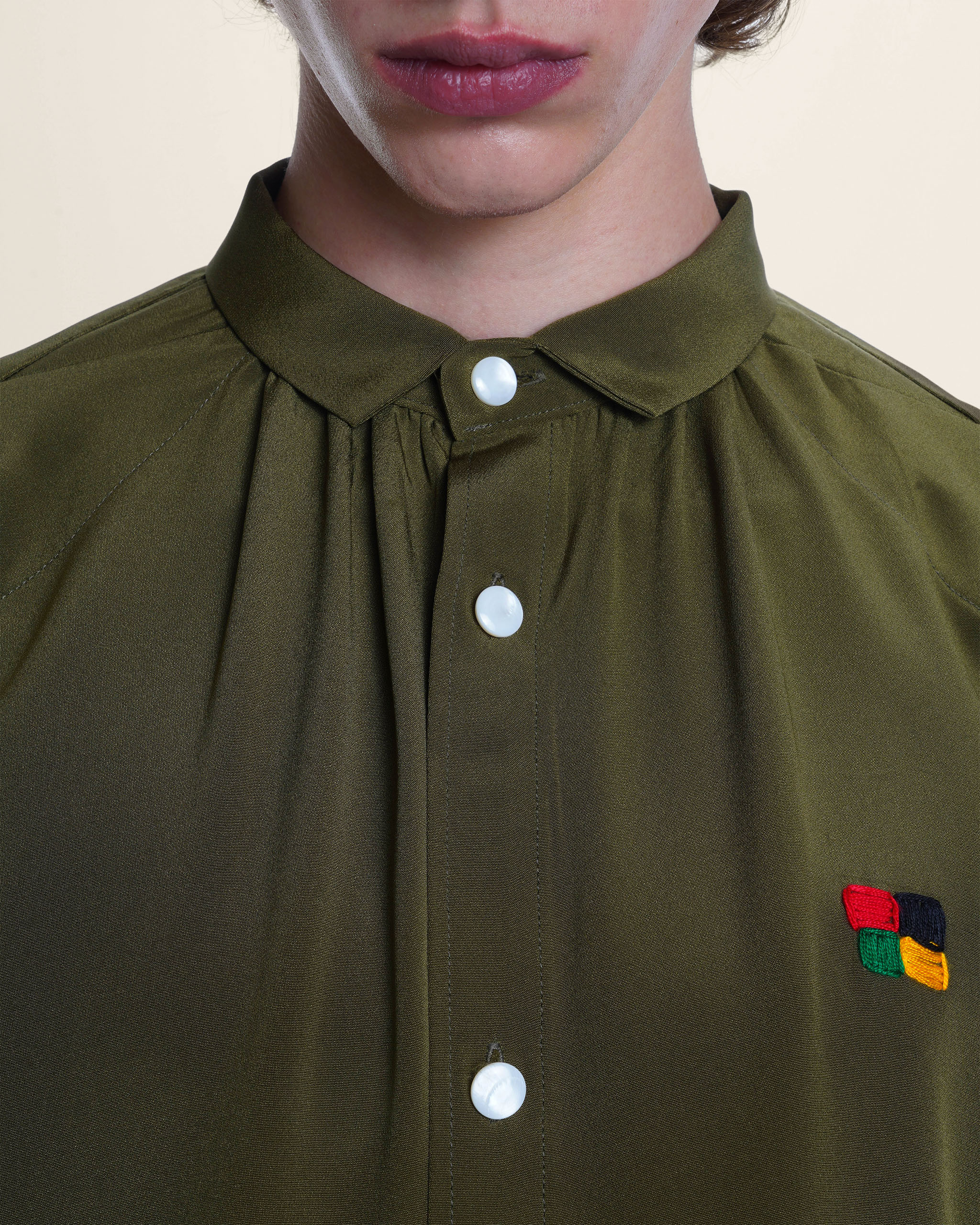 Crafted from 100% silk, this button-up shirt is designed with gentle pleats at the collar and cuffs, creating a voluminous, flowing silhouette. The front is finished with pearled buttons and a subtle embroidered technology motif at the chest.