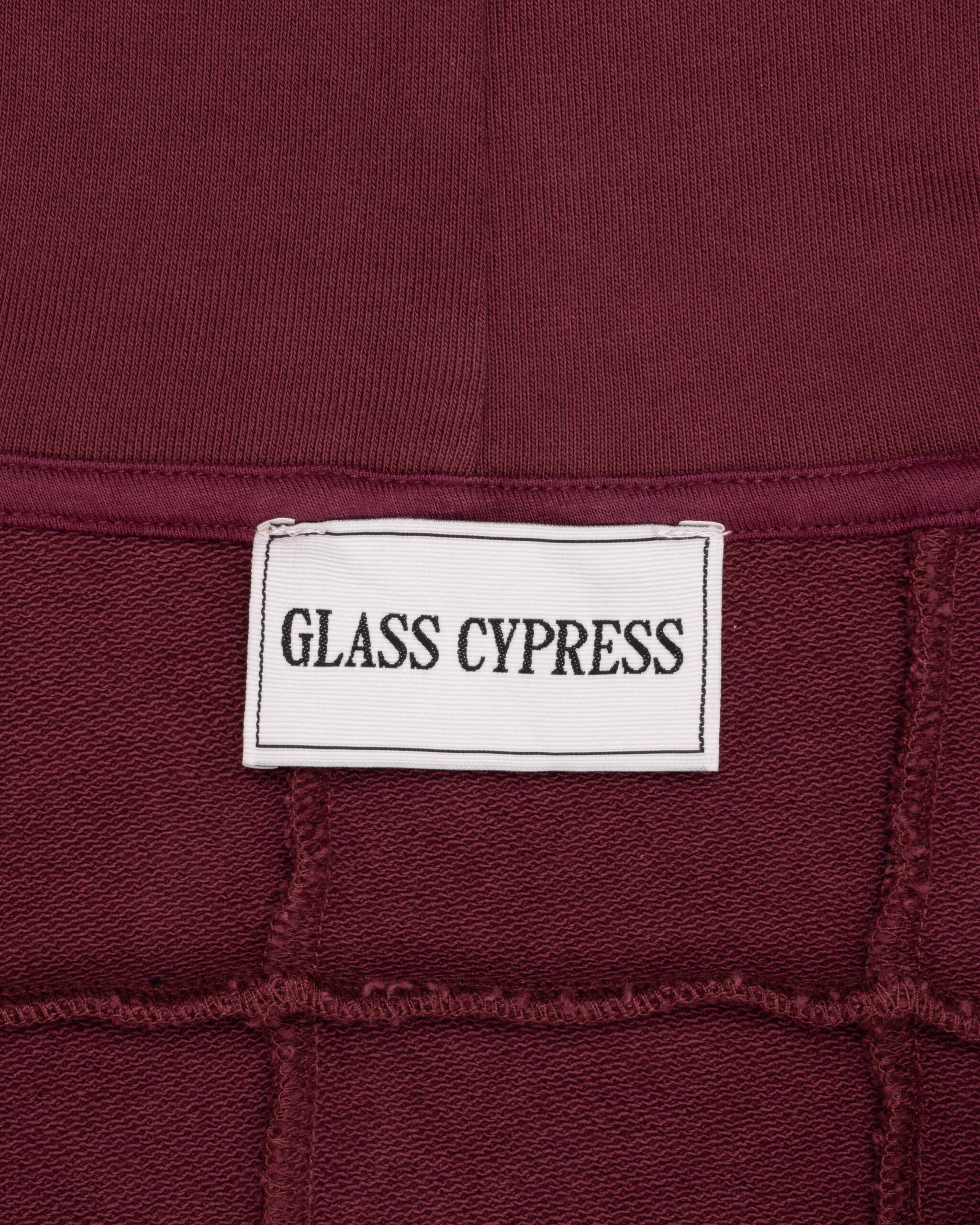 Built from individually hand-sewn panels, this hoodie turns a simple shape into something more considered. Cut in burgundy cotton with a standard fit. The patchwork texture adds quiet depth, finished with tonal drawstrings, metal zip, and front pockets.