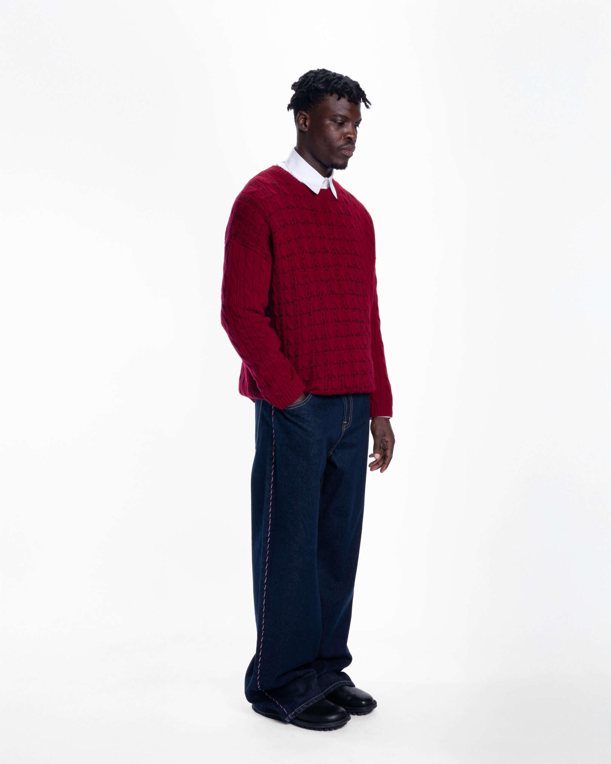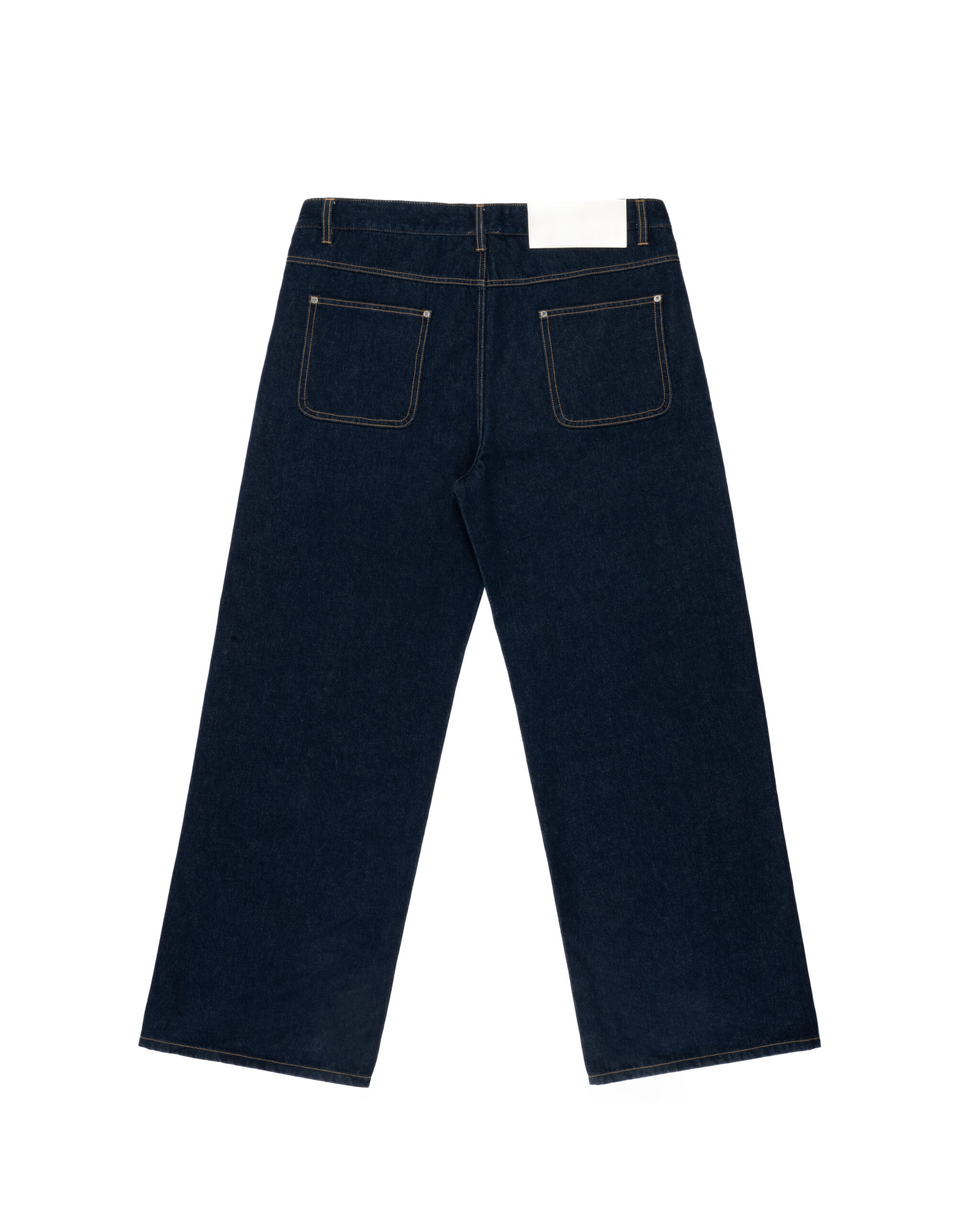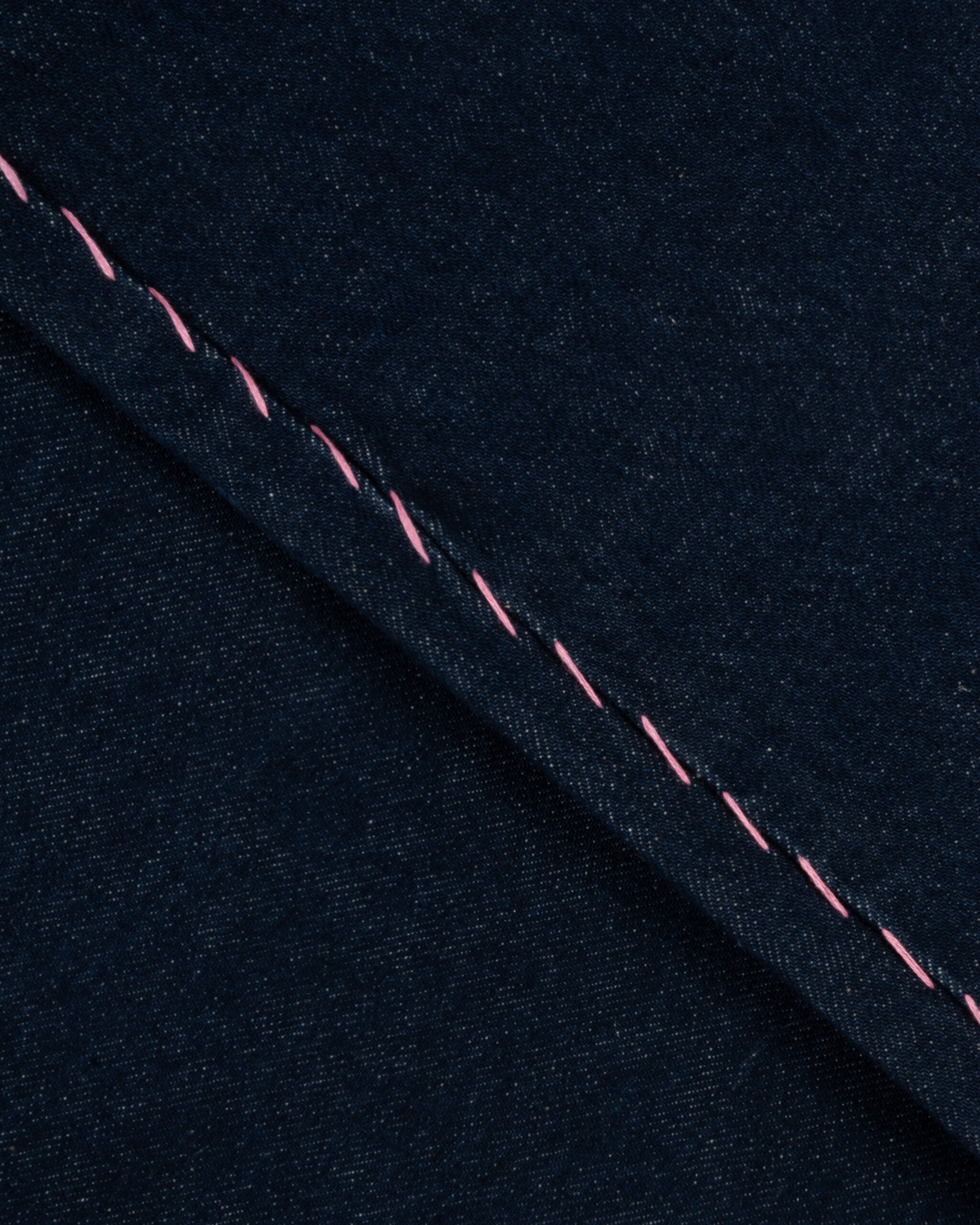 Oversized denim trouser cut from durable indigo cotton. The design is defined by wide proportions through the leg and contrast pink stitching running along the side seams. Traditional five-pocket construction, belt loops, and a button-and-zip closure keep the silhouette grounded in classic denim codes.