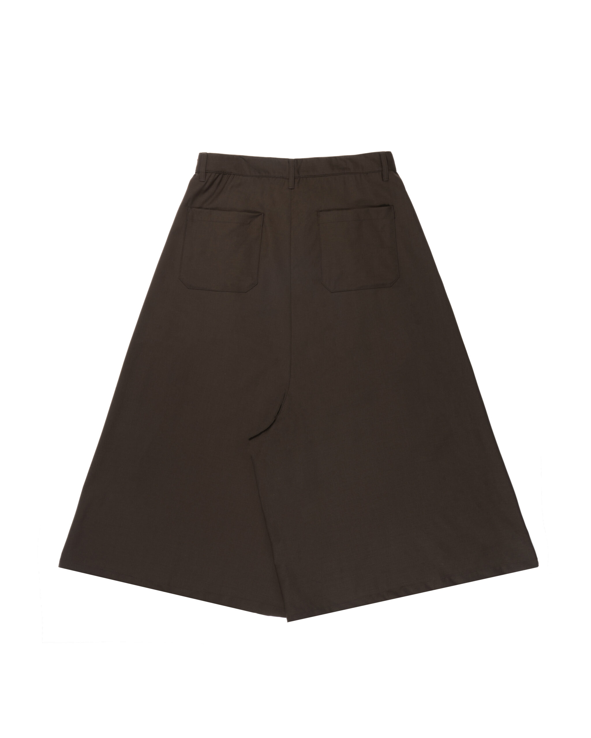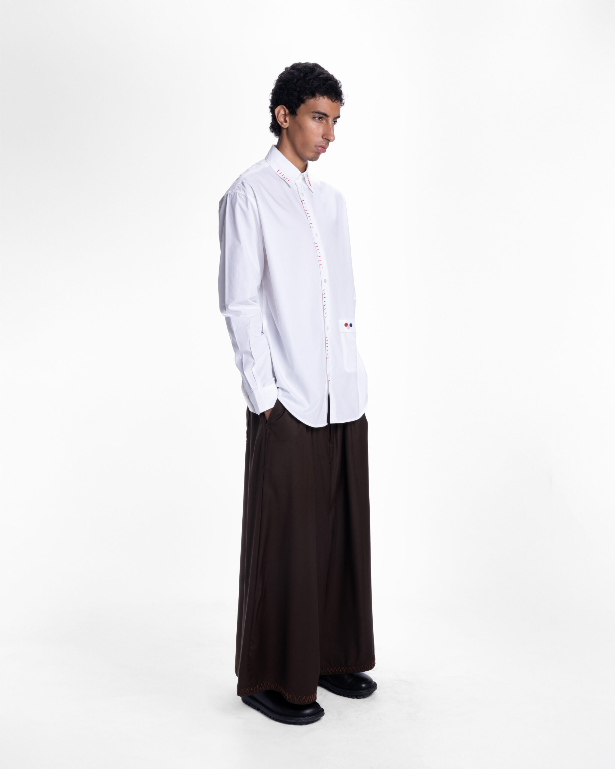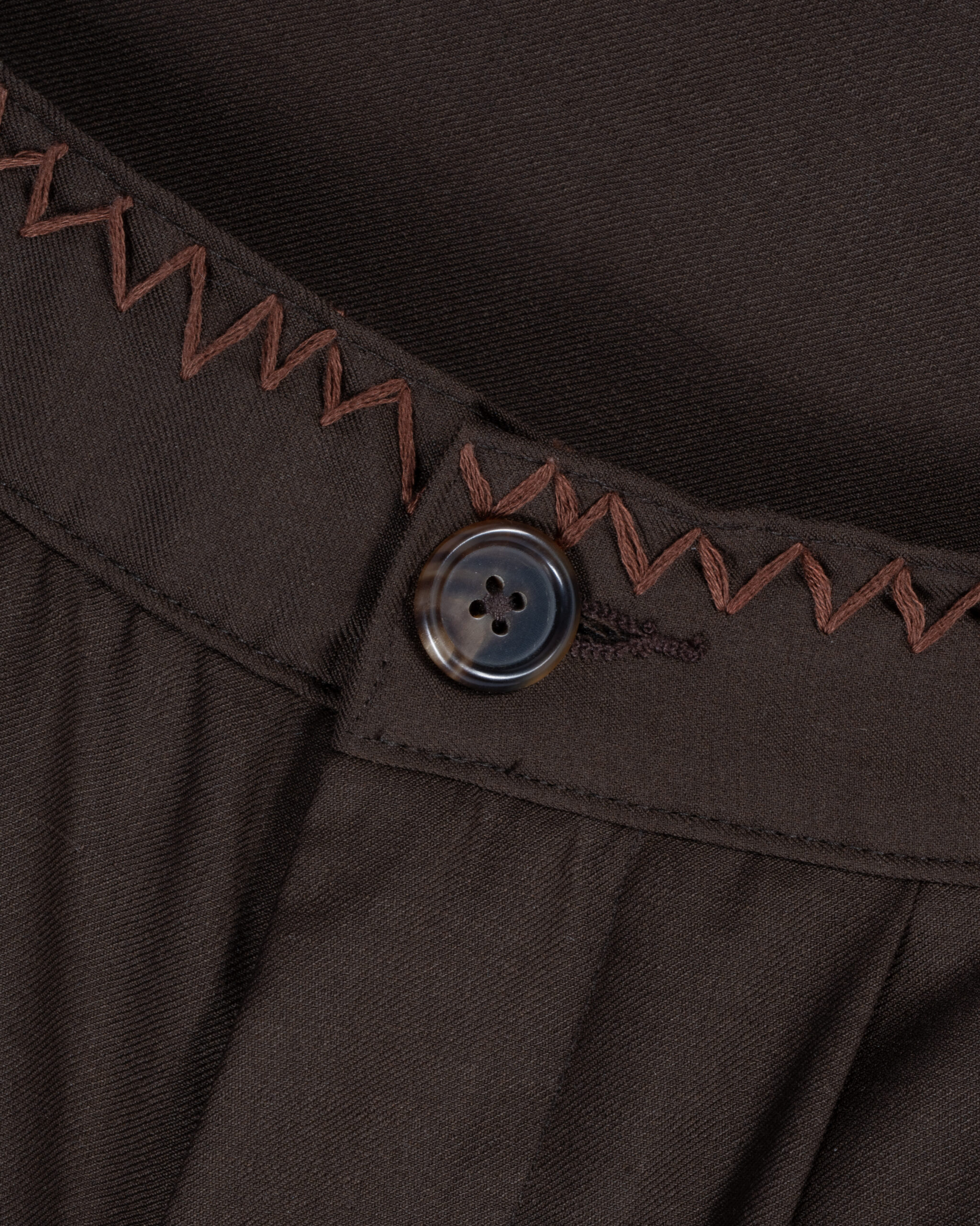 WIDE-LEG TROUSERS CUT FROM SMOOTH WOOL IN A DEEP BROWN TONE. THE SILHOUETTE IS DEFINED BY A GENEROUSLY FLARED LEG WITH FRONT PLEATS THAT ADD CONTROLLED VOLUME AND DRAPE. AT THE WAISTBAND AND HEMS, HAND-EMBROIDERED ZIG-ZAG STITCHING IN WARM BROWN THREAD INTRODUCES A CRAFTED DETAIL AGAINST THE CLEAN SURFACE. SIDE SLANT POCKETS AND BACK POCKETS COMPLETE THE FUNCTIONAL ELEMENTS.