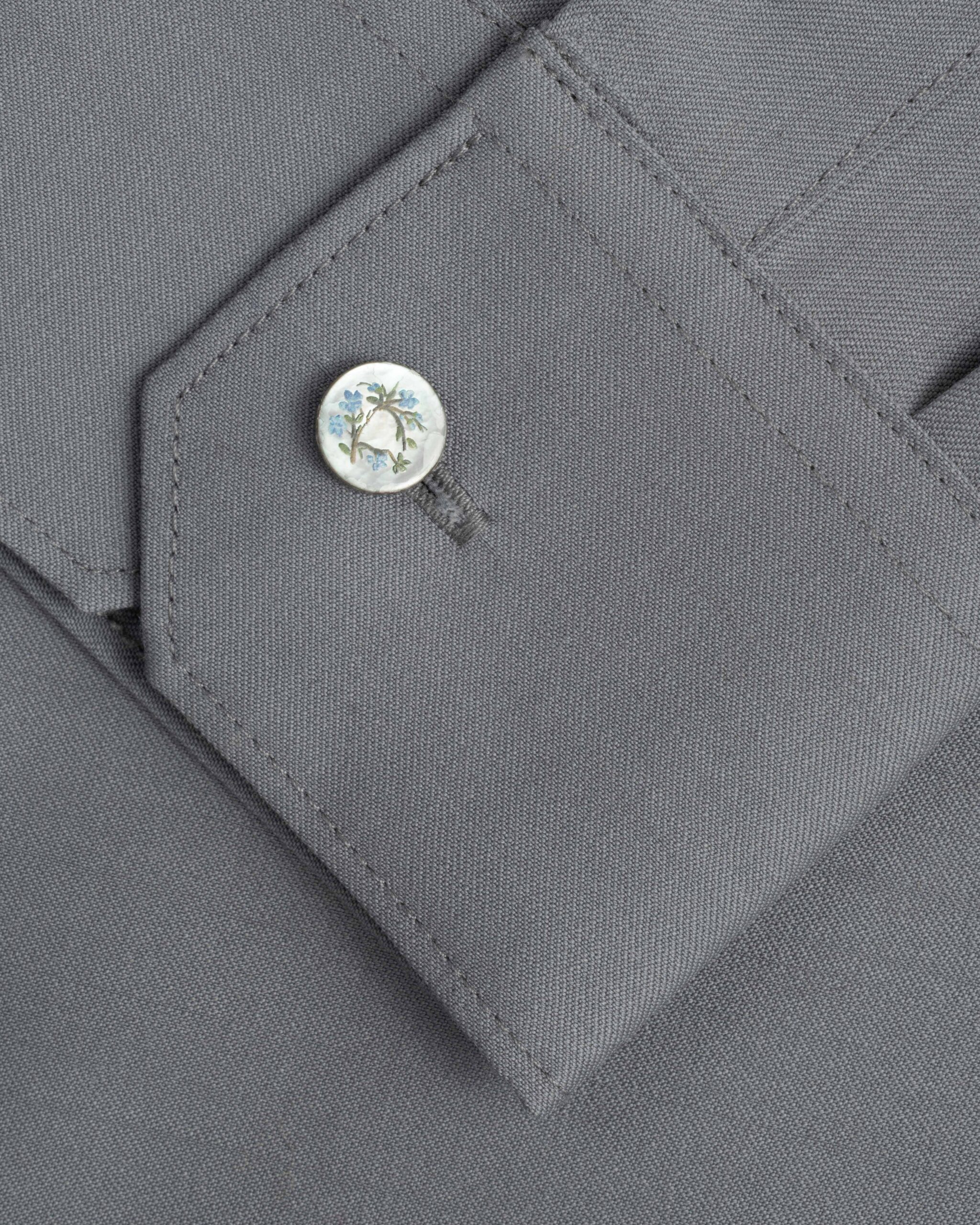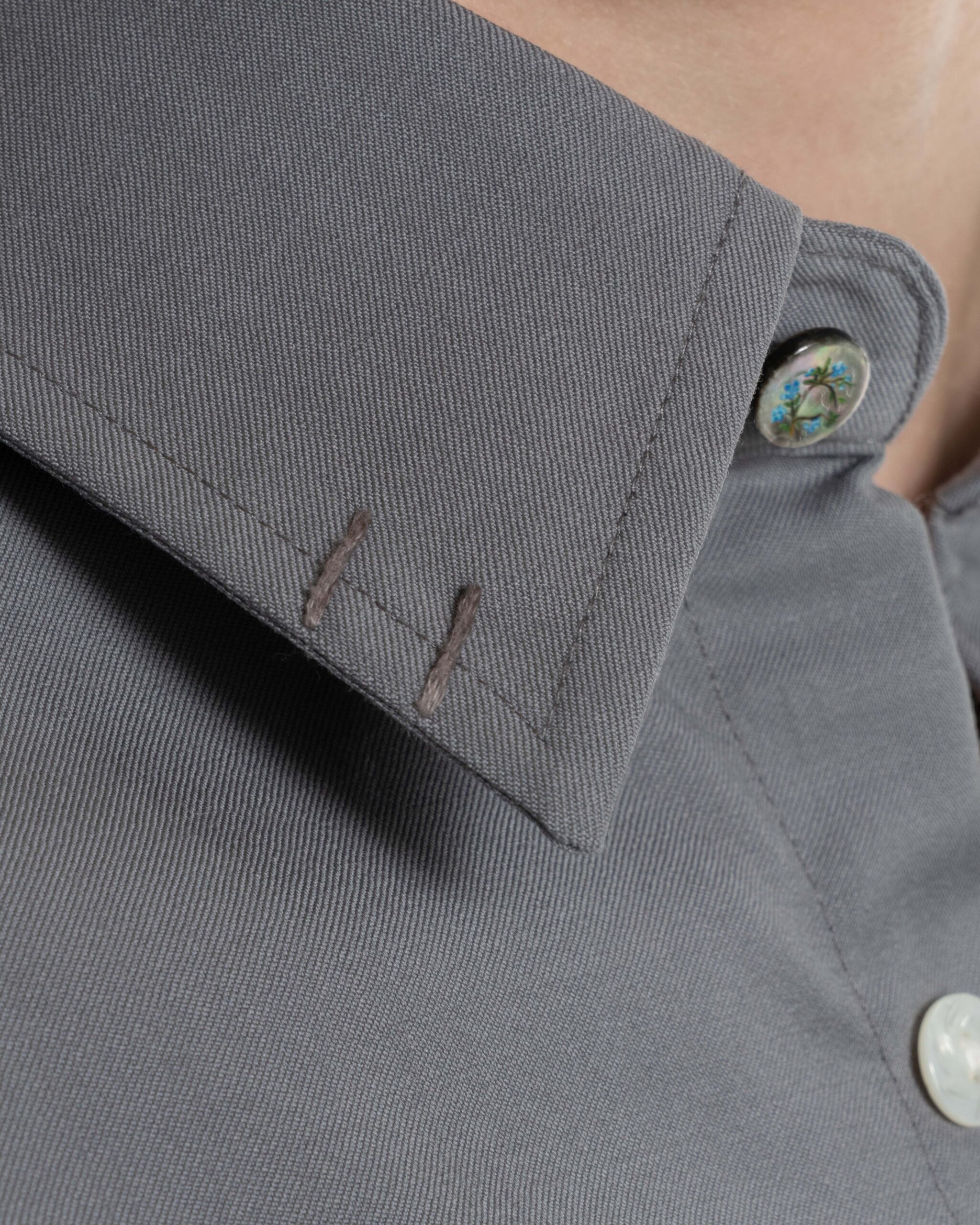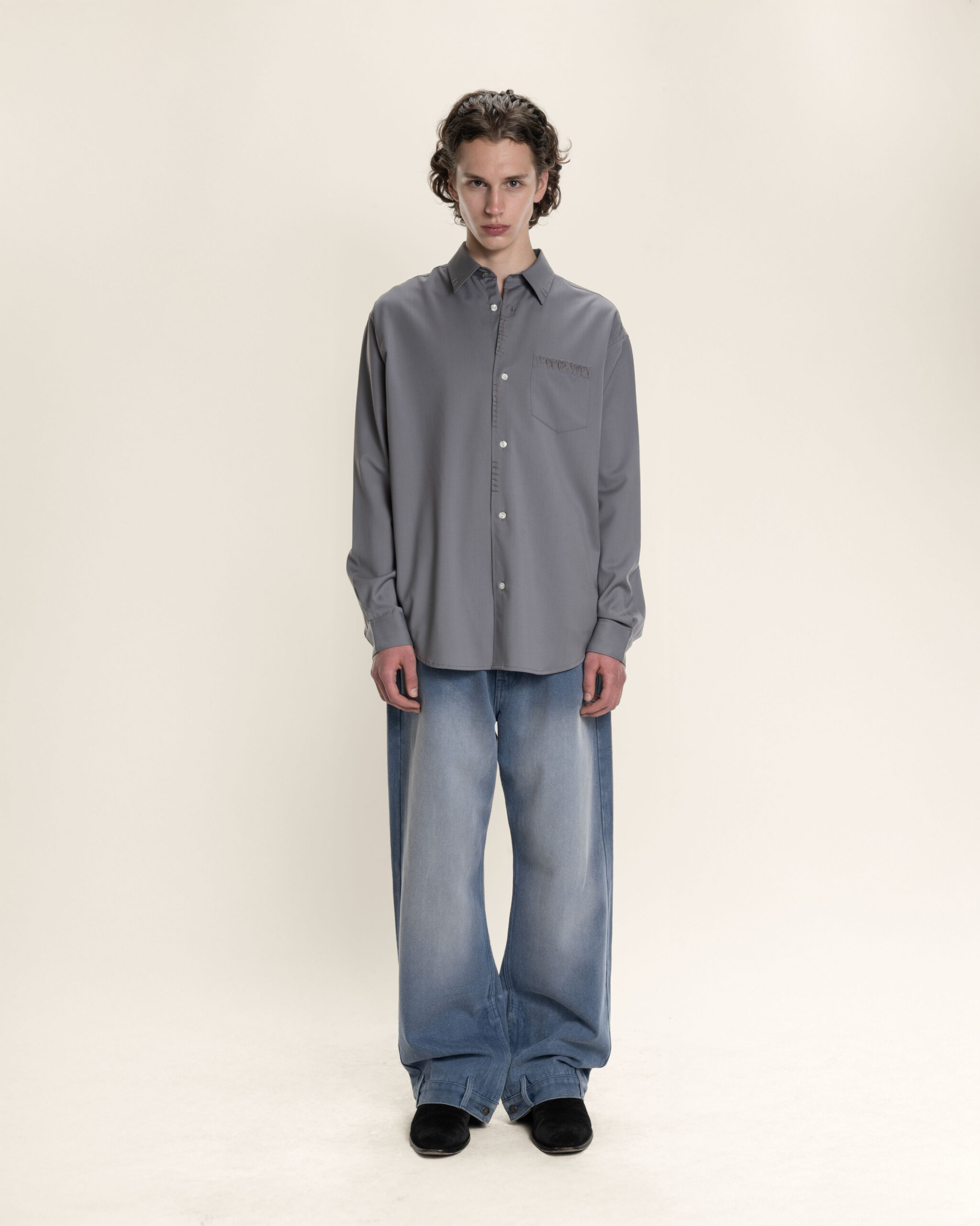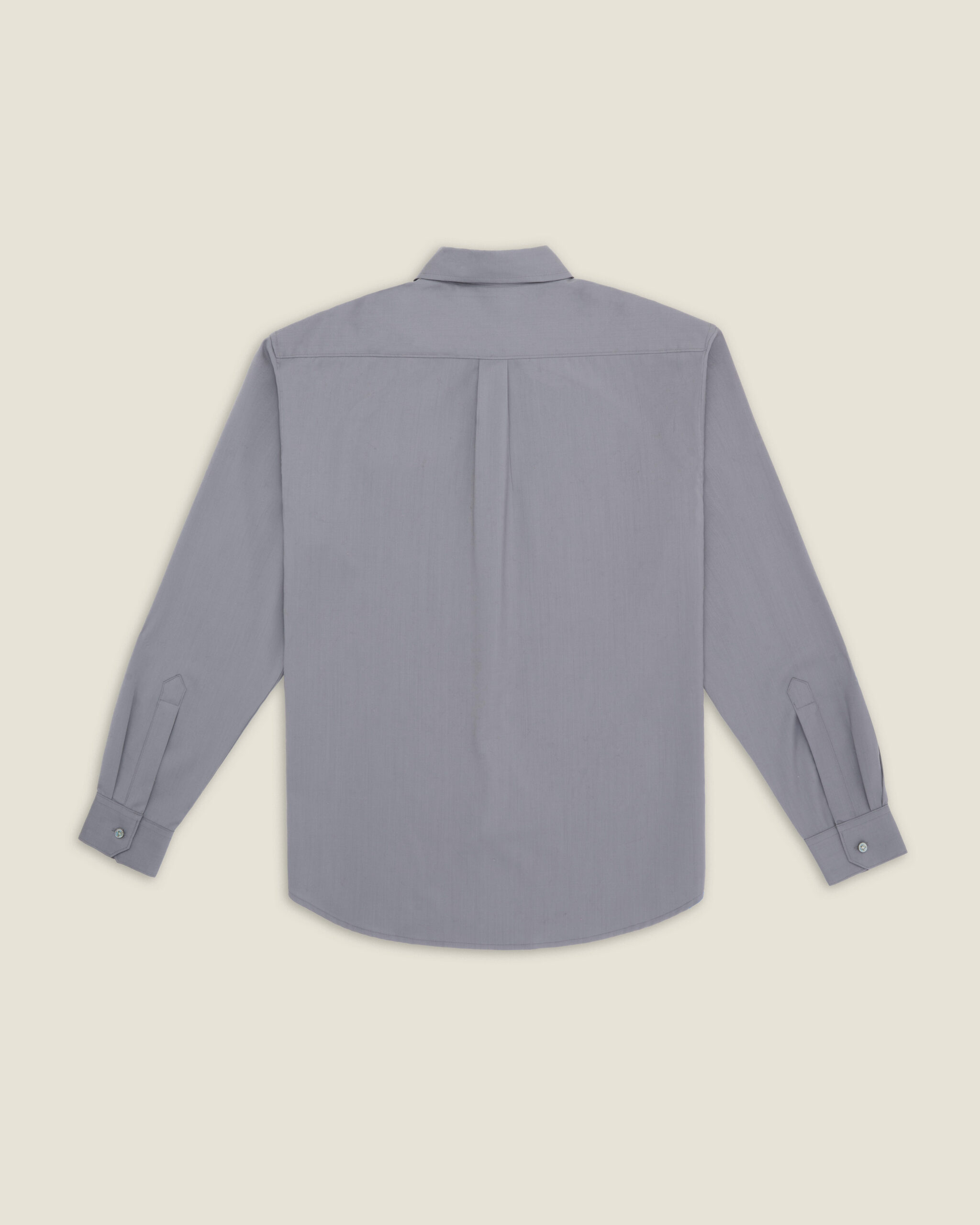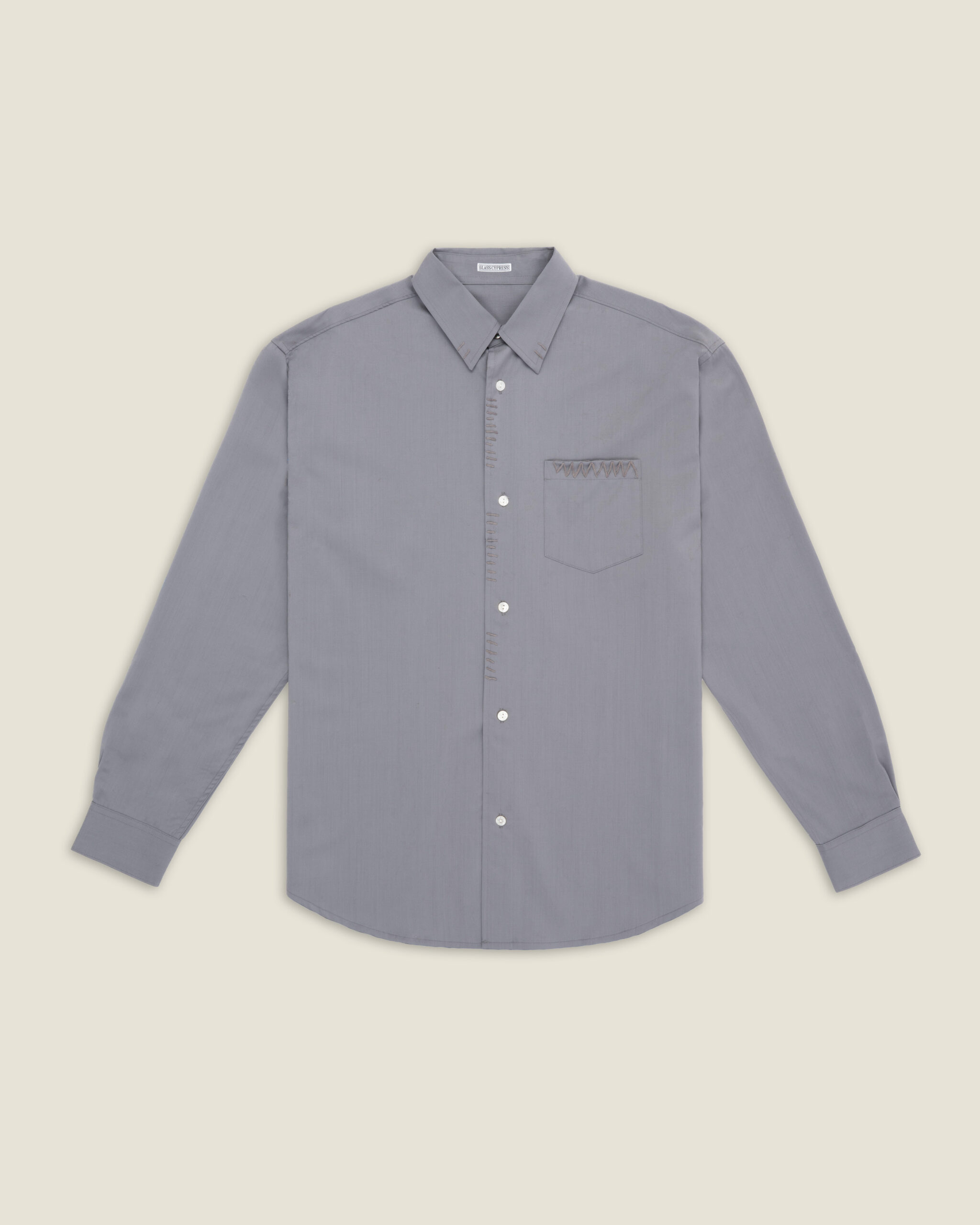 Cut from a soft midweight cotton, this long-sleeve shirt is rendered in a versatile shade of gray. It features a standard fit and subtle textural contrast in its tailoring. Hand-done running stitch embroidery lines the top edge of the chest pocket, continues along the button placket, and finishes at the collar — adding a quiet sense of craft to an otherwise minimal silhouette.