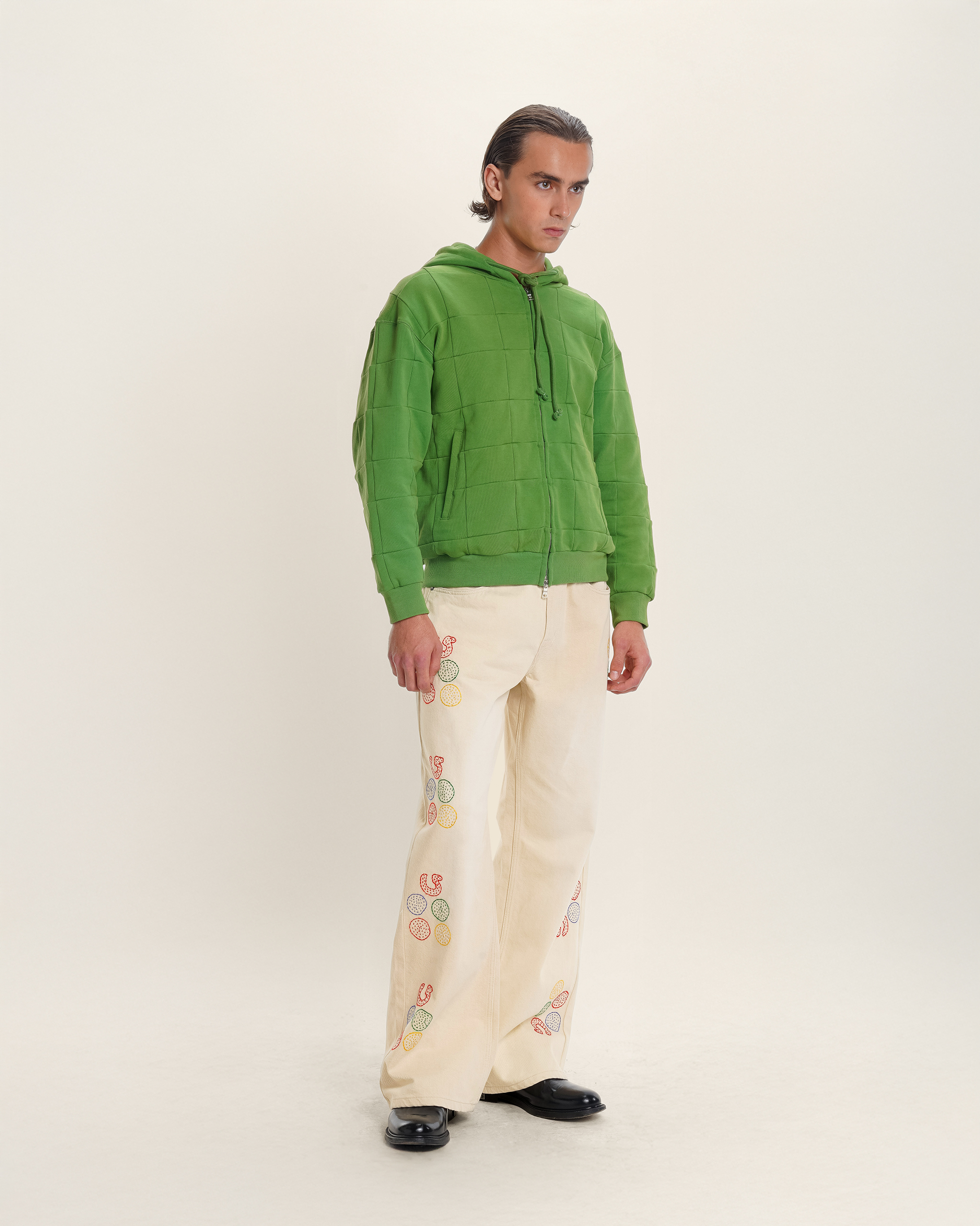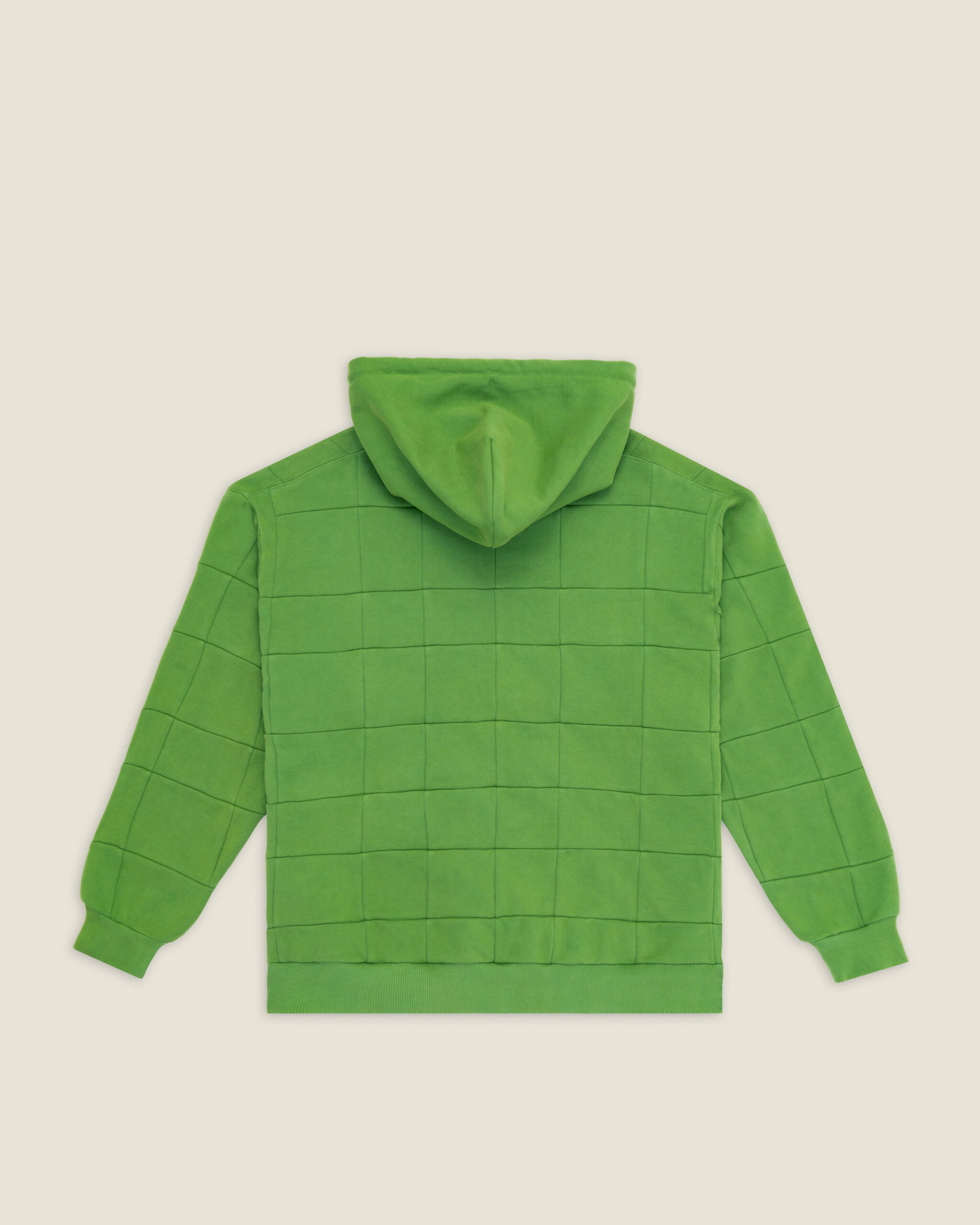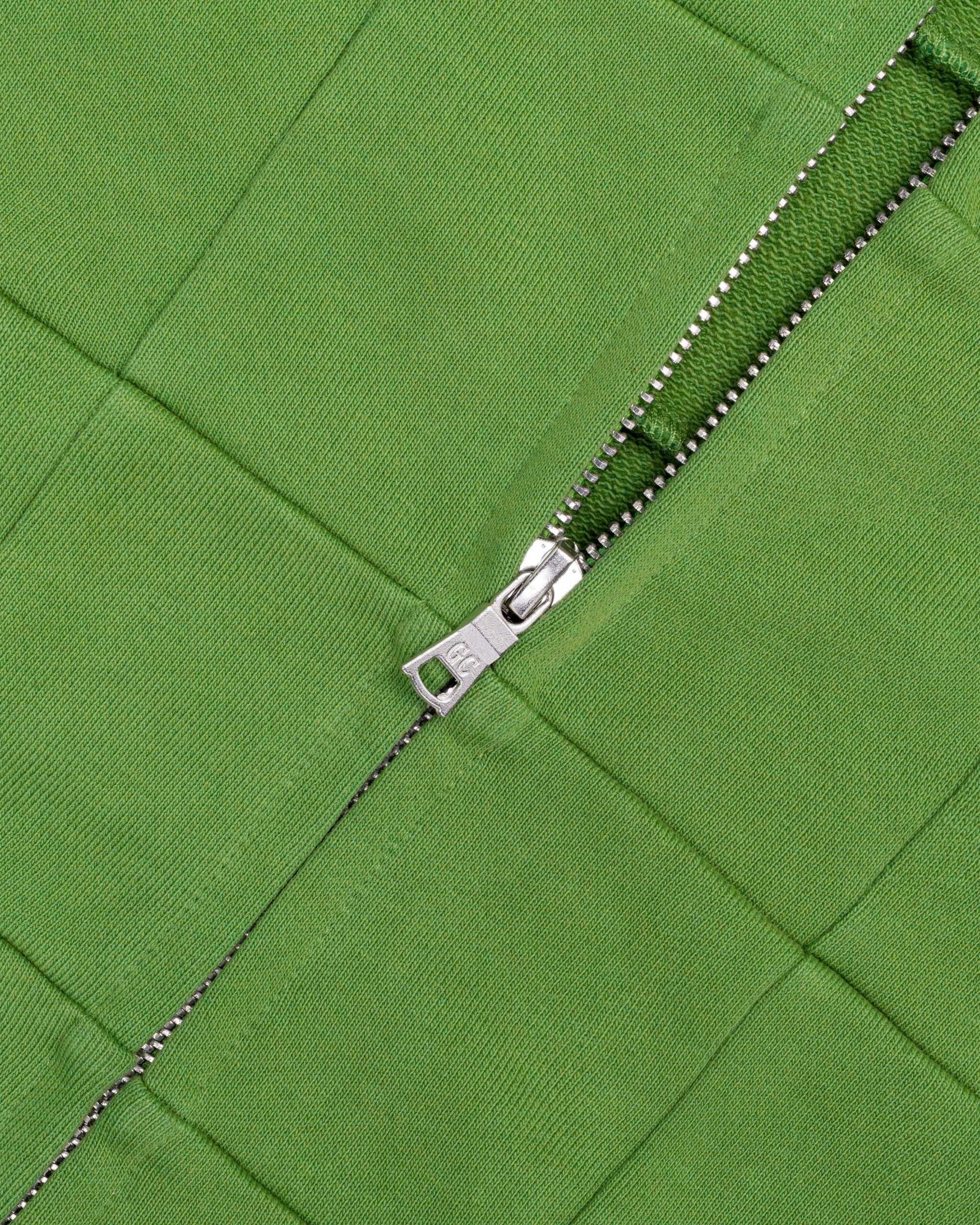 Crafted from cotton in green, this zip-up hoodie features an all-over patchwork grid design, each panel meticulously assembled by hand. The standard silhouette is balanced by a structured two-way zipper and ribbed cuffs and hem. An oversized hood and subtle slant pockets add comfort and ease to this textural staple.