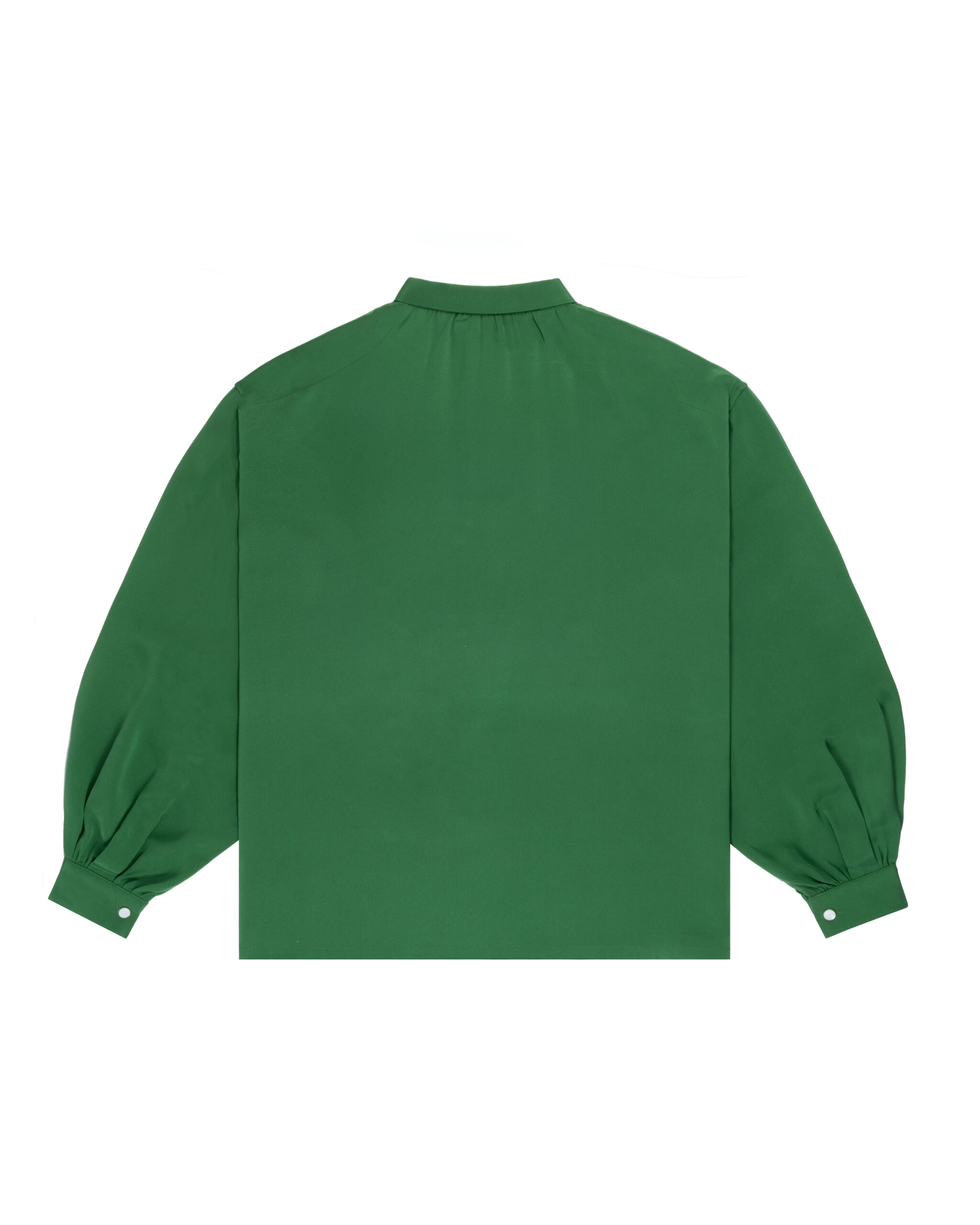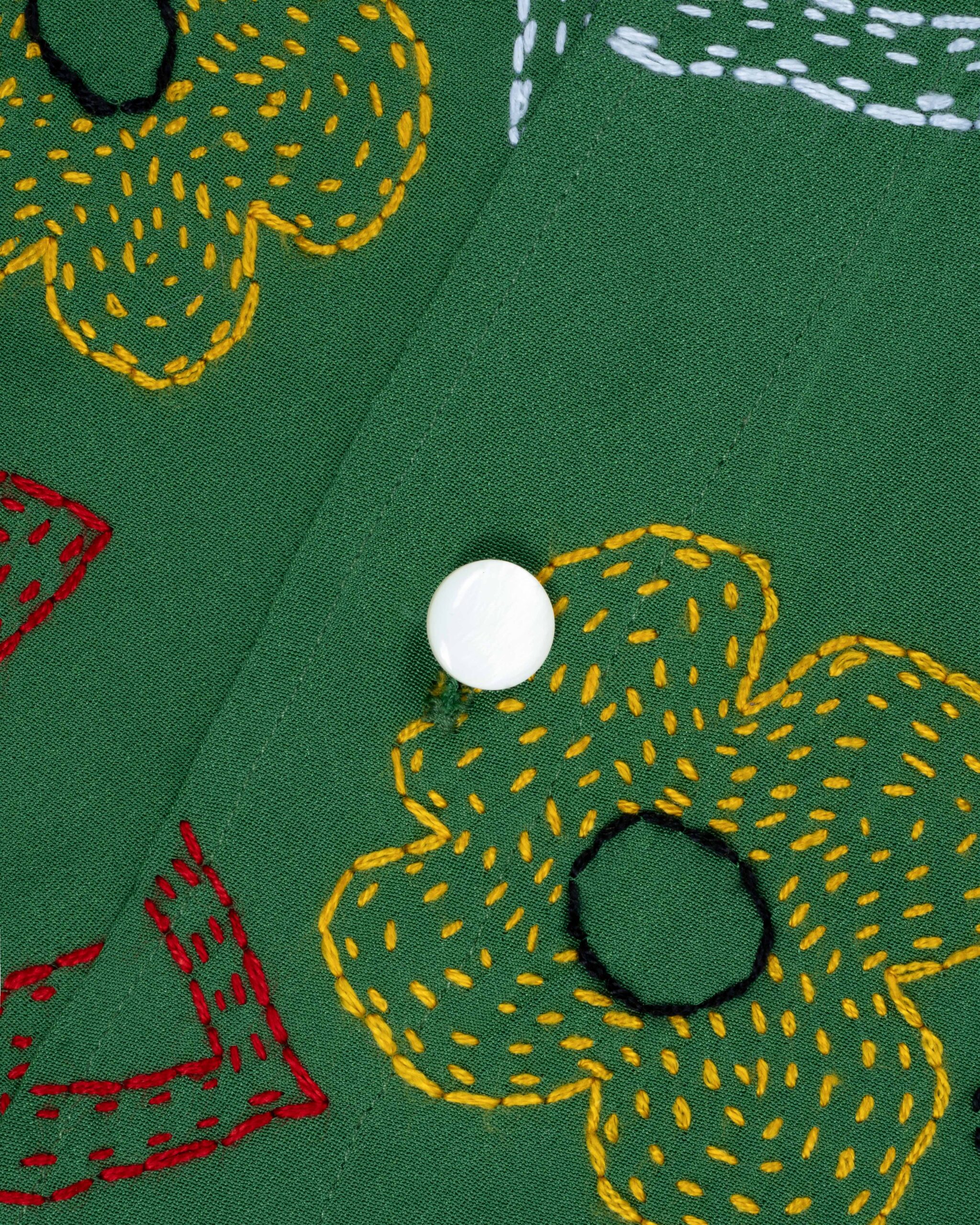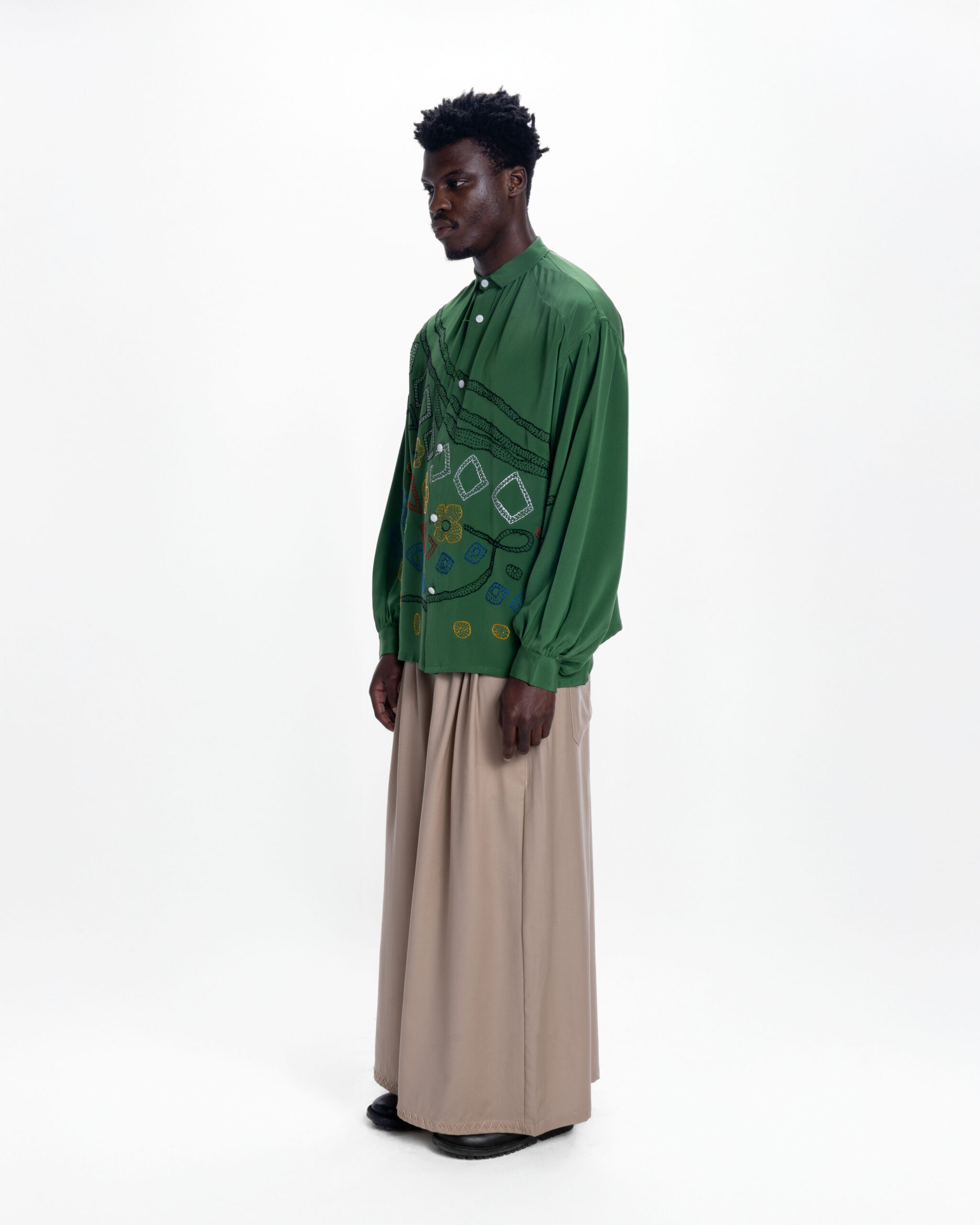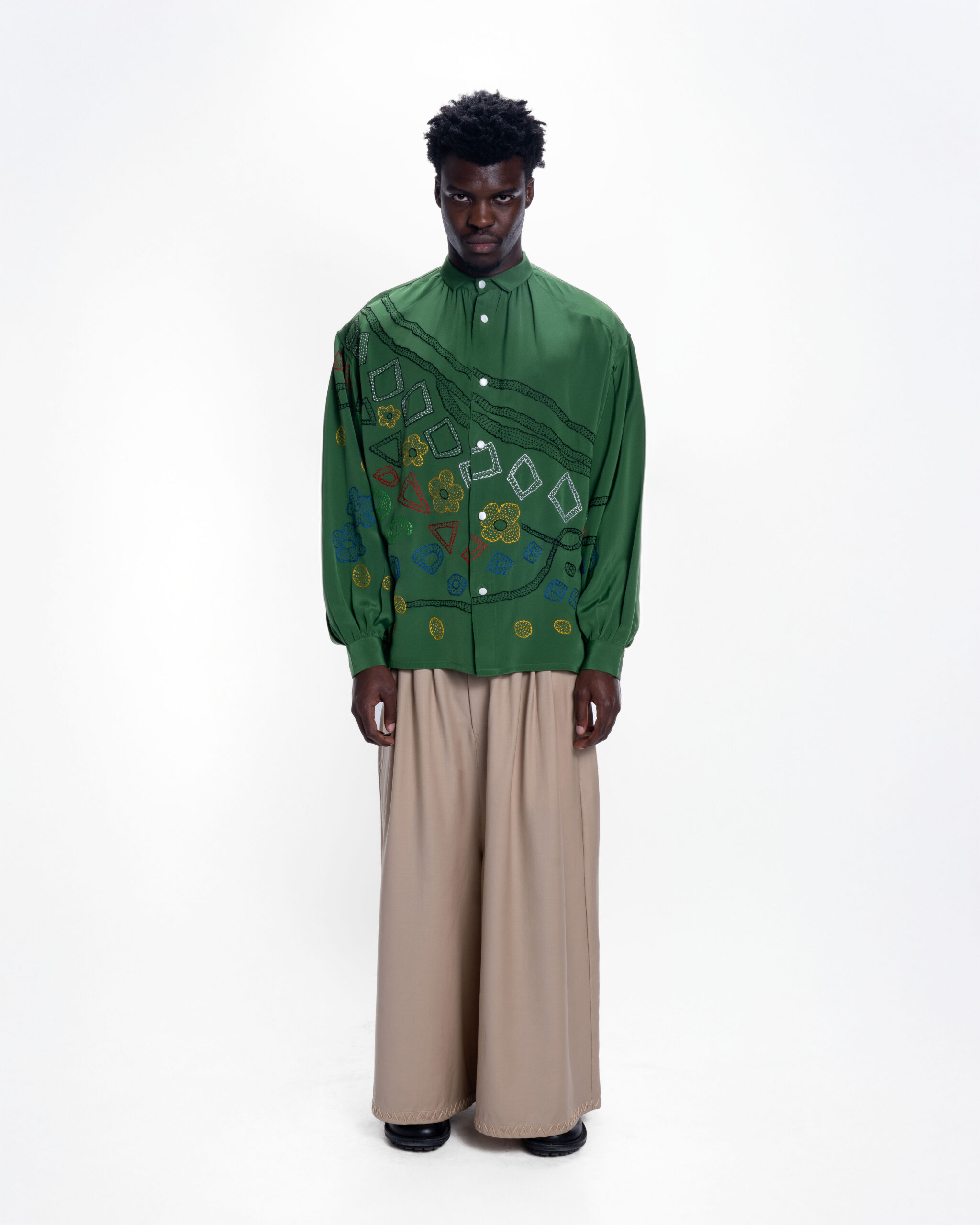 RELAXED LONG-SLEEVE SHIRT CUT FROM PURE SILK IN A VIVID EMERALD GREEN. THE FRONT PANEL FEATURES AN ARRAY OF HAND-EMBROIDERED GEOMETRIC AND FLORAL MOTIFS IN MULTICOLORED THREADS — EACH SHAPE CAREFULLY STITCHED TO CREATE A LAYERED, TEXTURAL SURFACE. FINISHED WITH A plead and pointed COLLAR.