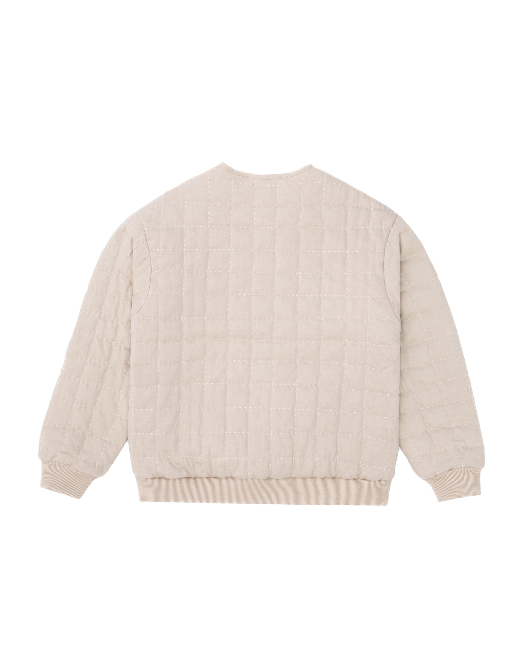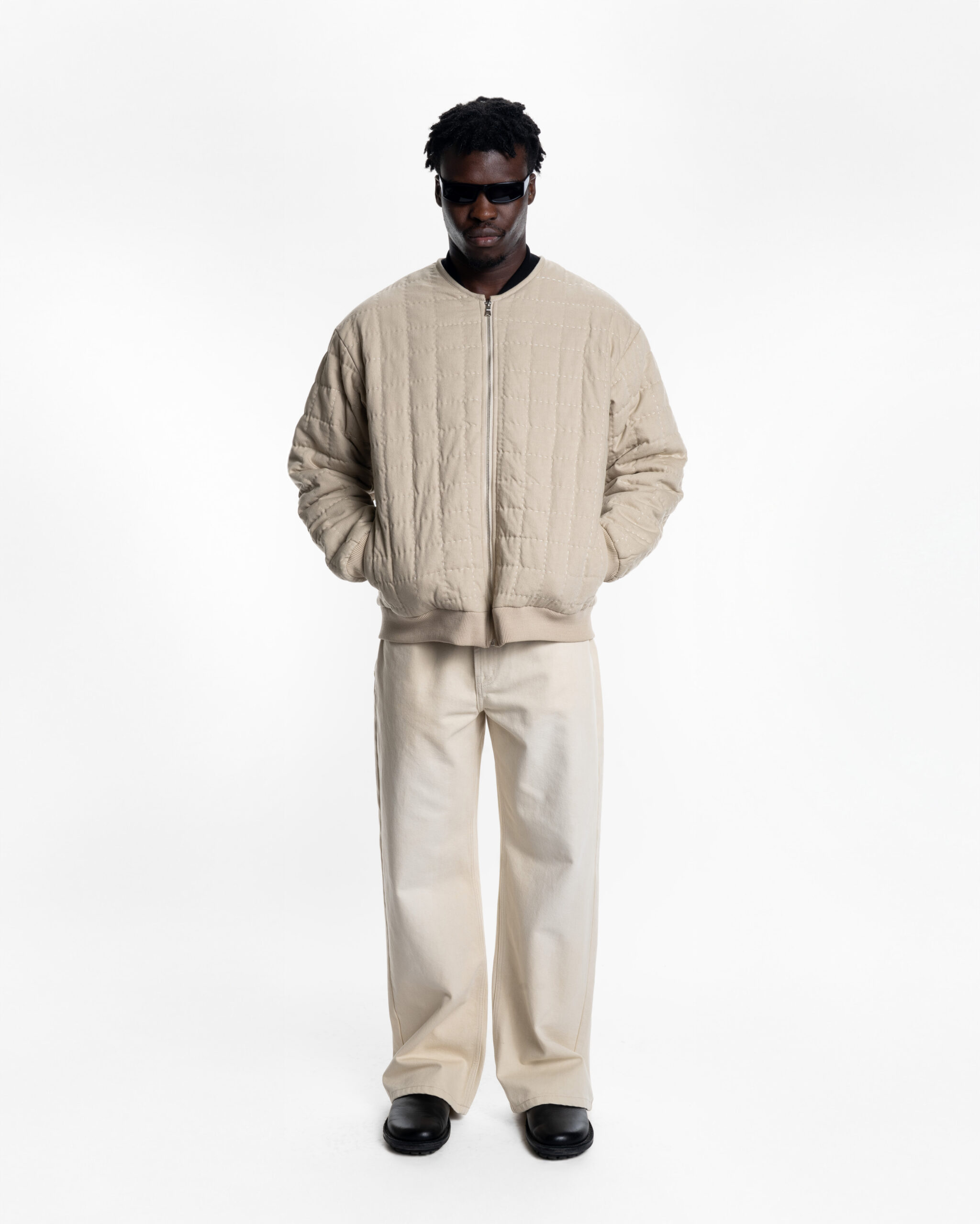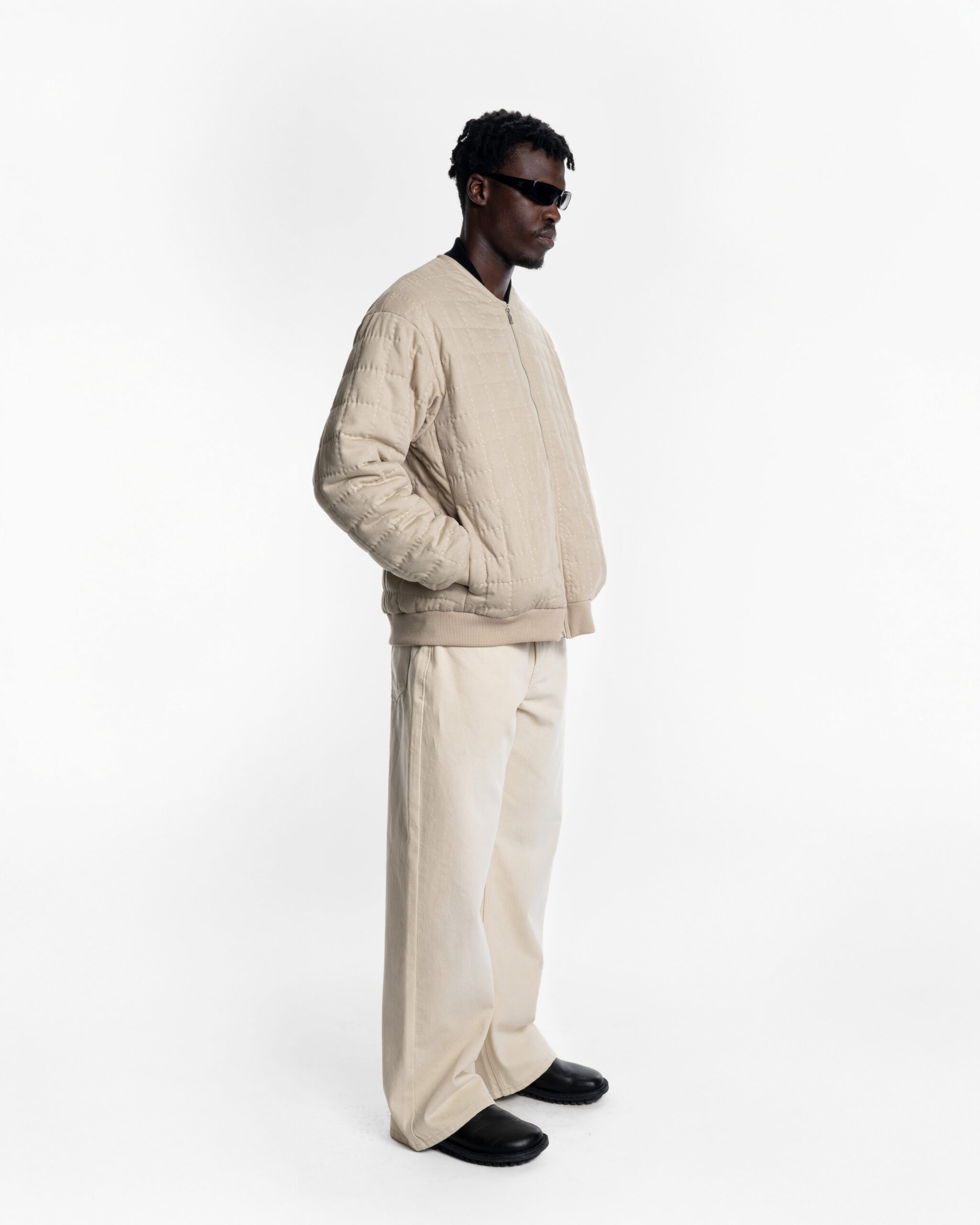 The Ivory Bomber is crafted from quilted fabric with a soft padded structure, offering both texture and insulation. Designed with a clean bomber silhouette, it features a ribbed collar, cuffs, hem, and boro stitching for subtle contrast and a secure fit. A full-length zipper runs through the front, maintaining a streamlined shape.