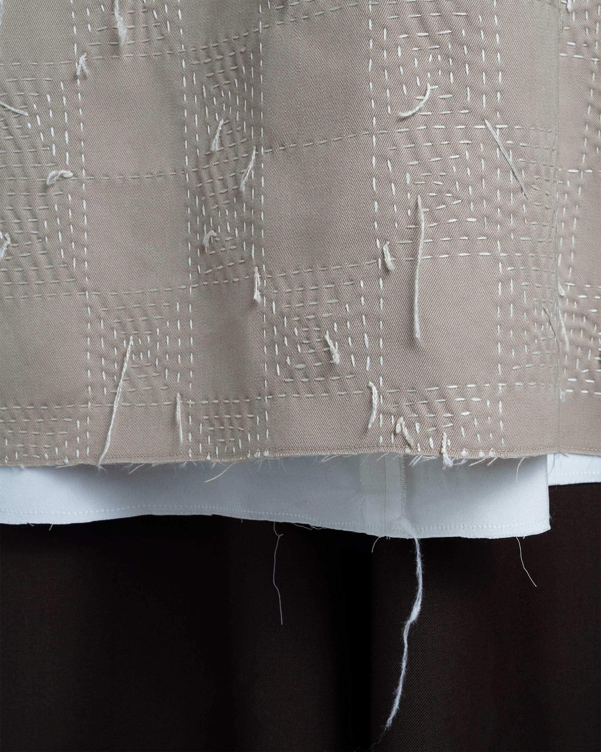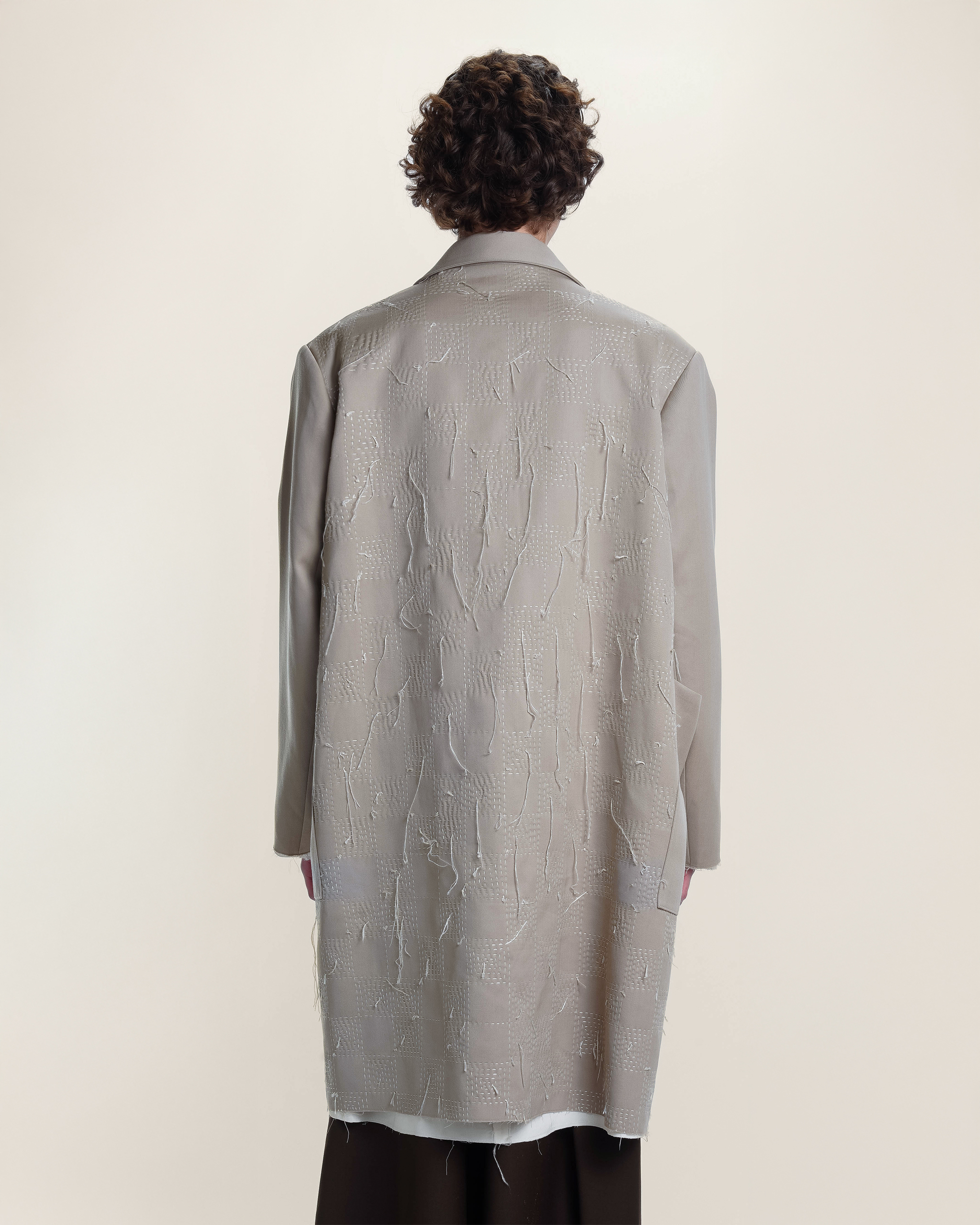 A long khaki coat cut in a relaxed silhouette, designed with a tonal sheer overlay that extends past the hem for a layered finish. Loose hanging threads across the back introduce raw texture, balanced by angled pockets and a clean button front.