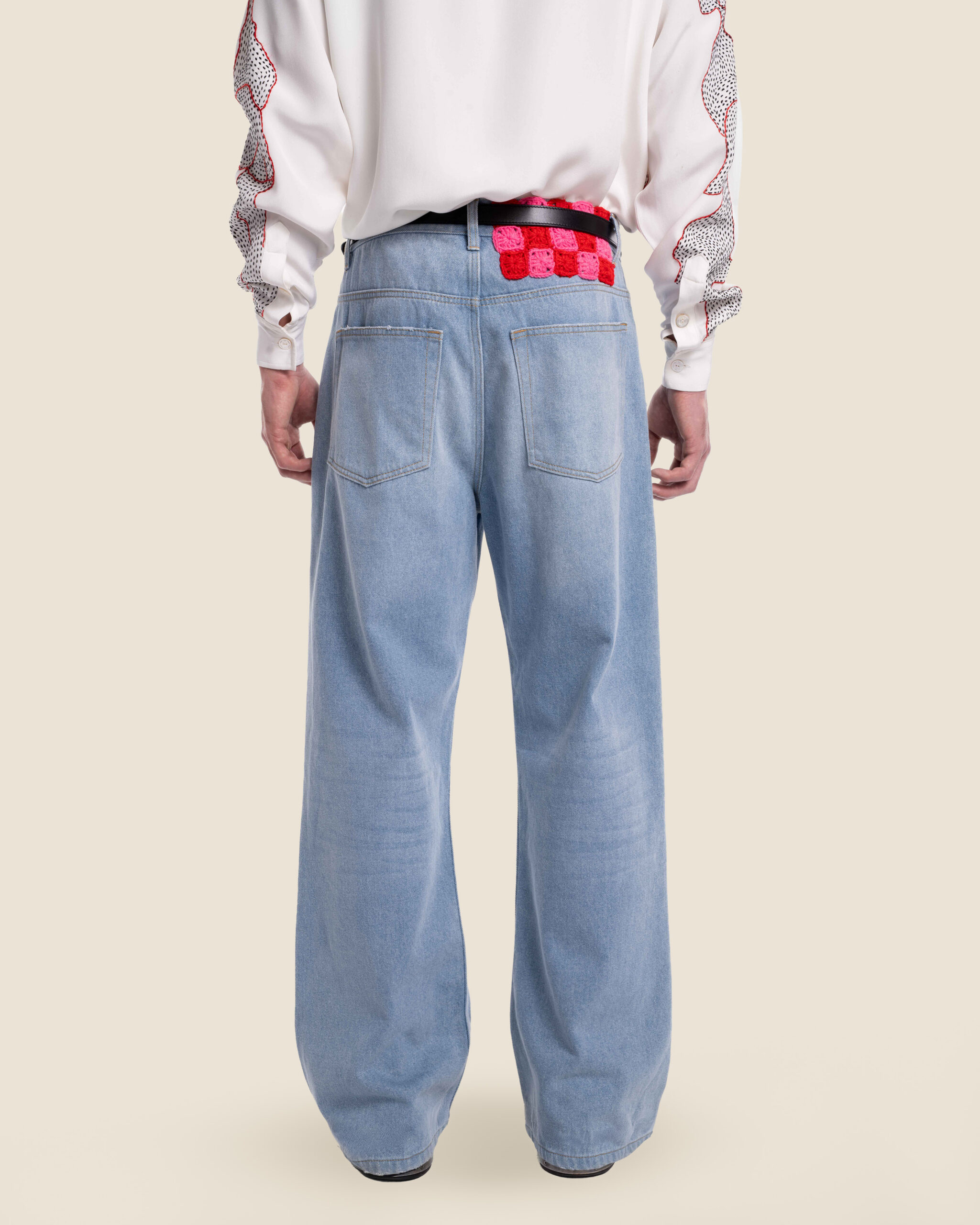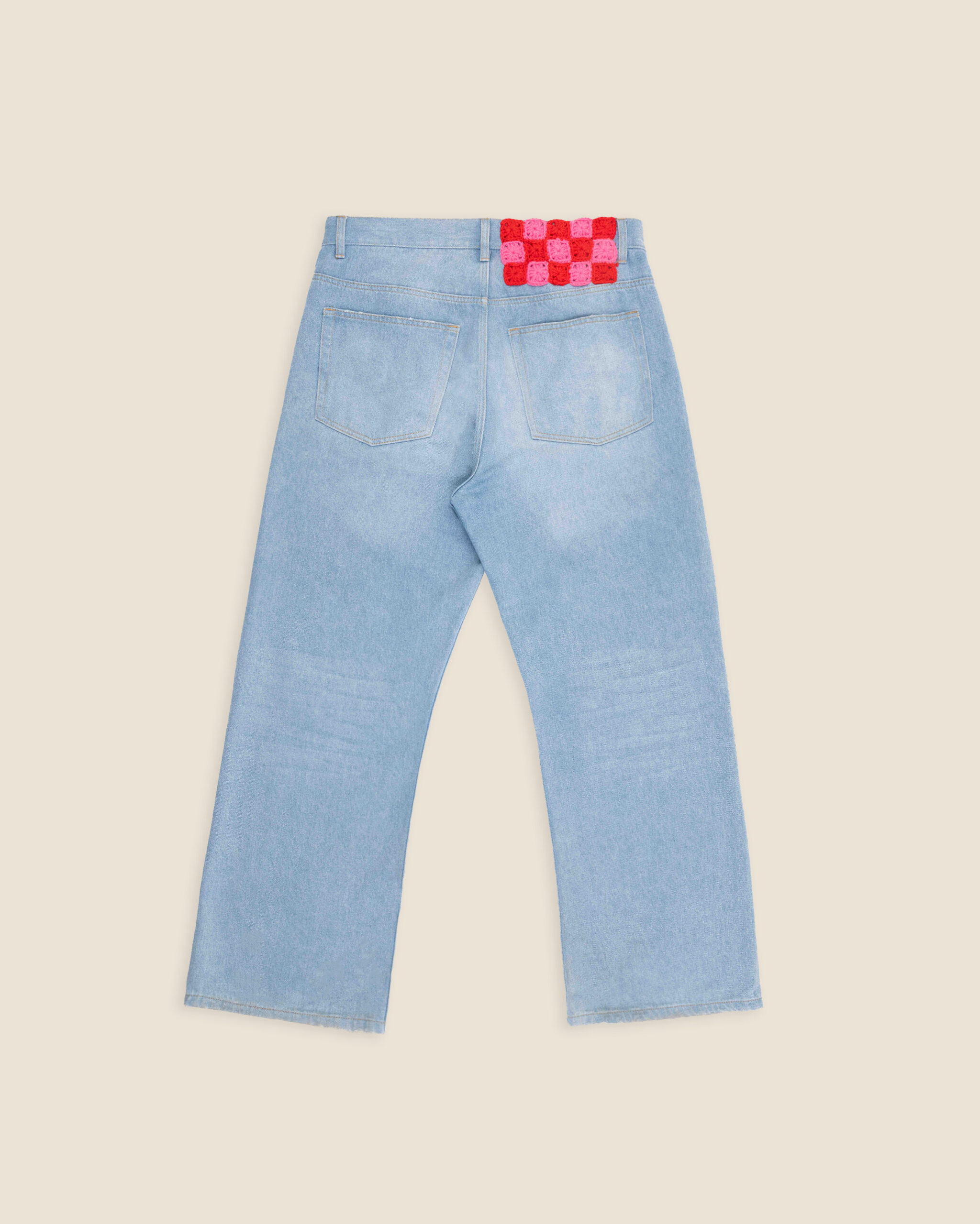 Designed with traditional five-pocket construction, the jeans are finished with light distressing at the front and a hand-crafted crochet patch detail at the back waistband. A zip fly closure and reinforced belt loops complete the construction.