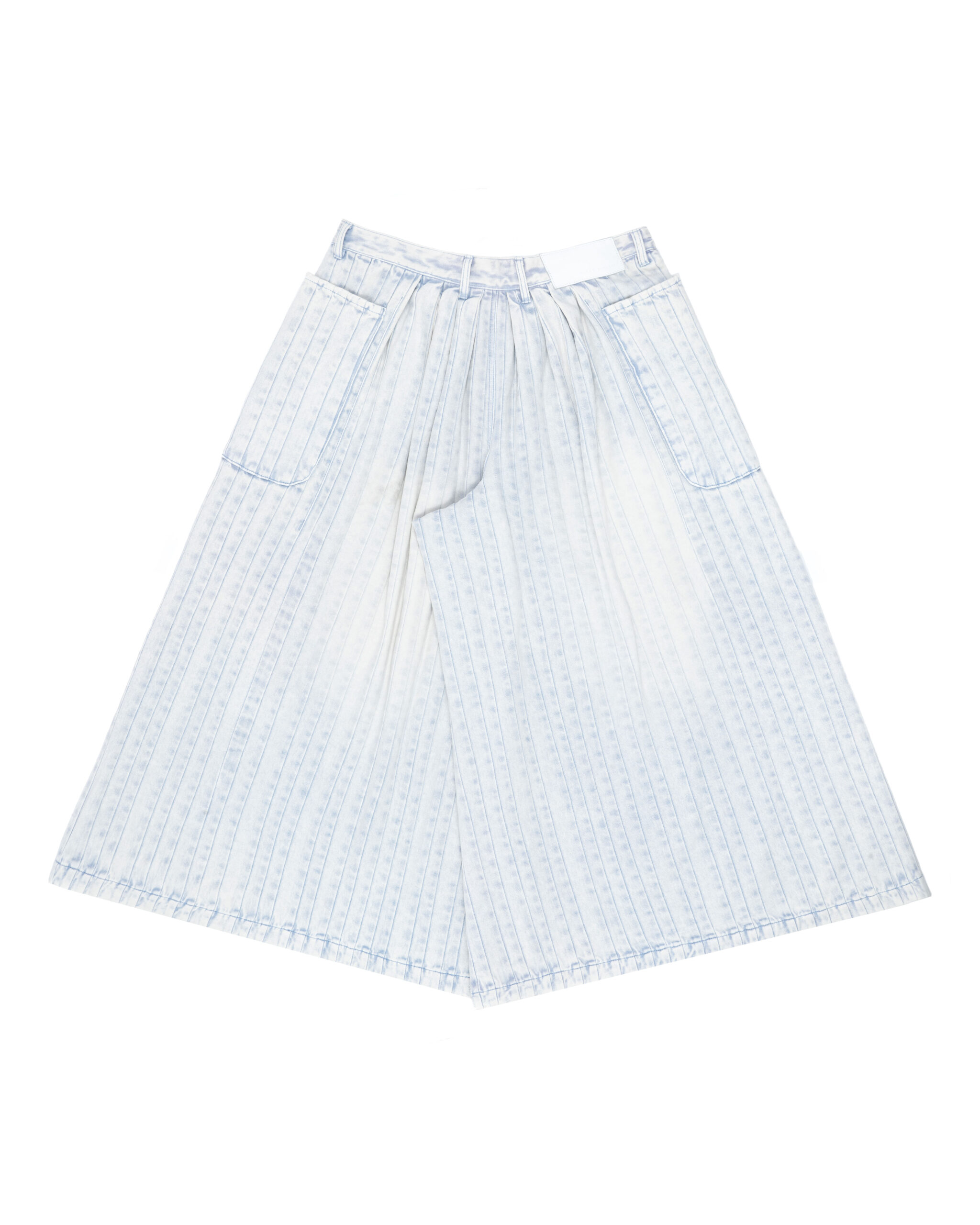 - The light blue wash softens the bold proportions, allowing the panel work to stand out with clarity. Cut with an exaggerated wide leg, the trousers highlight scale and movement while retaining structural weight through heavy fabric. Finished with belt loops, a button-and-zip closure, and rear patch pockets, the piece balances functionality with a disciplined architectural form.