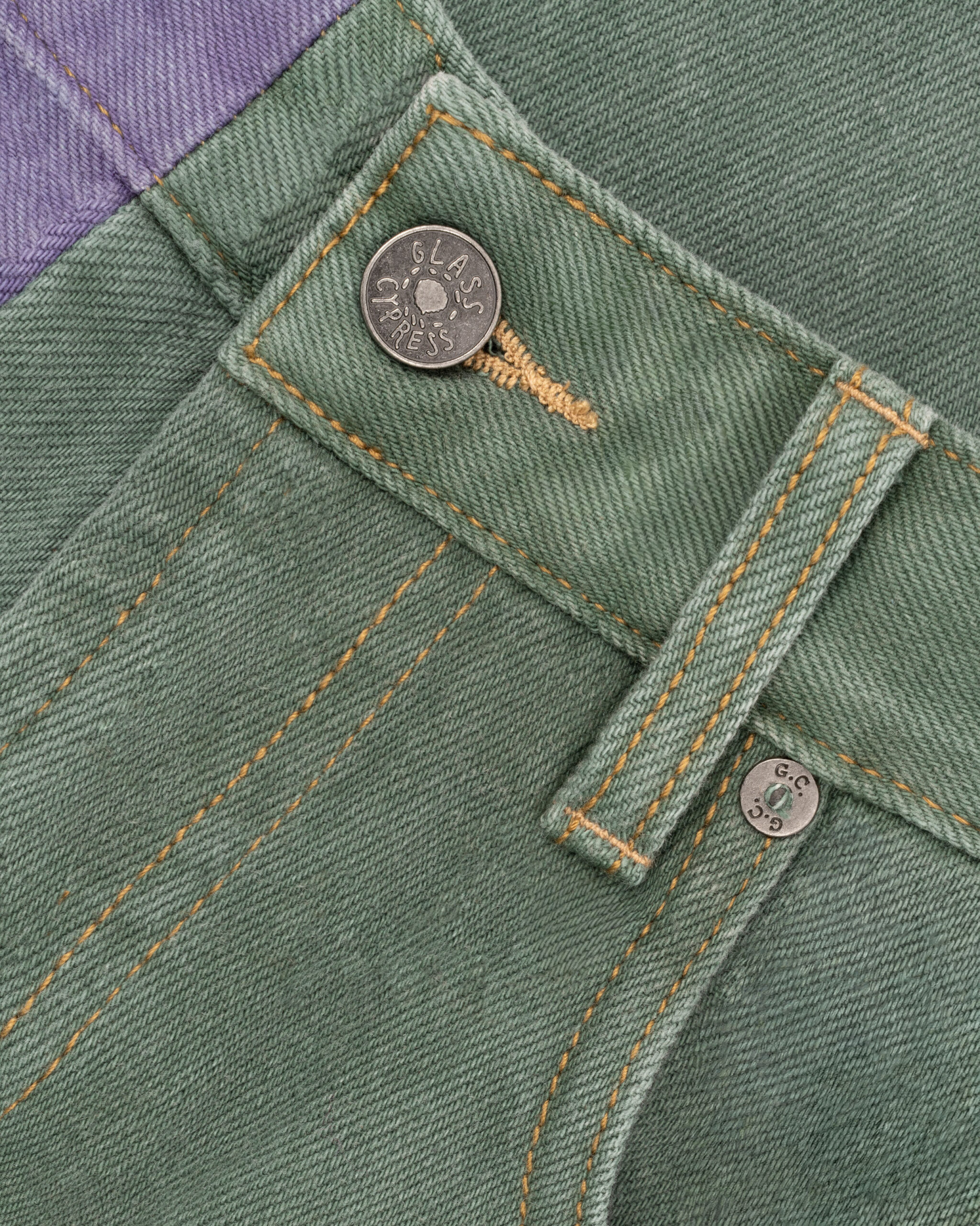 DETAILS: MULTICOLOR PANEL CONSTRUCTION; FIVE-POCKET DESIGN; HAND-SEWN SEAMS; CONTRAST STITCHING