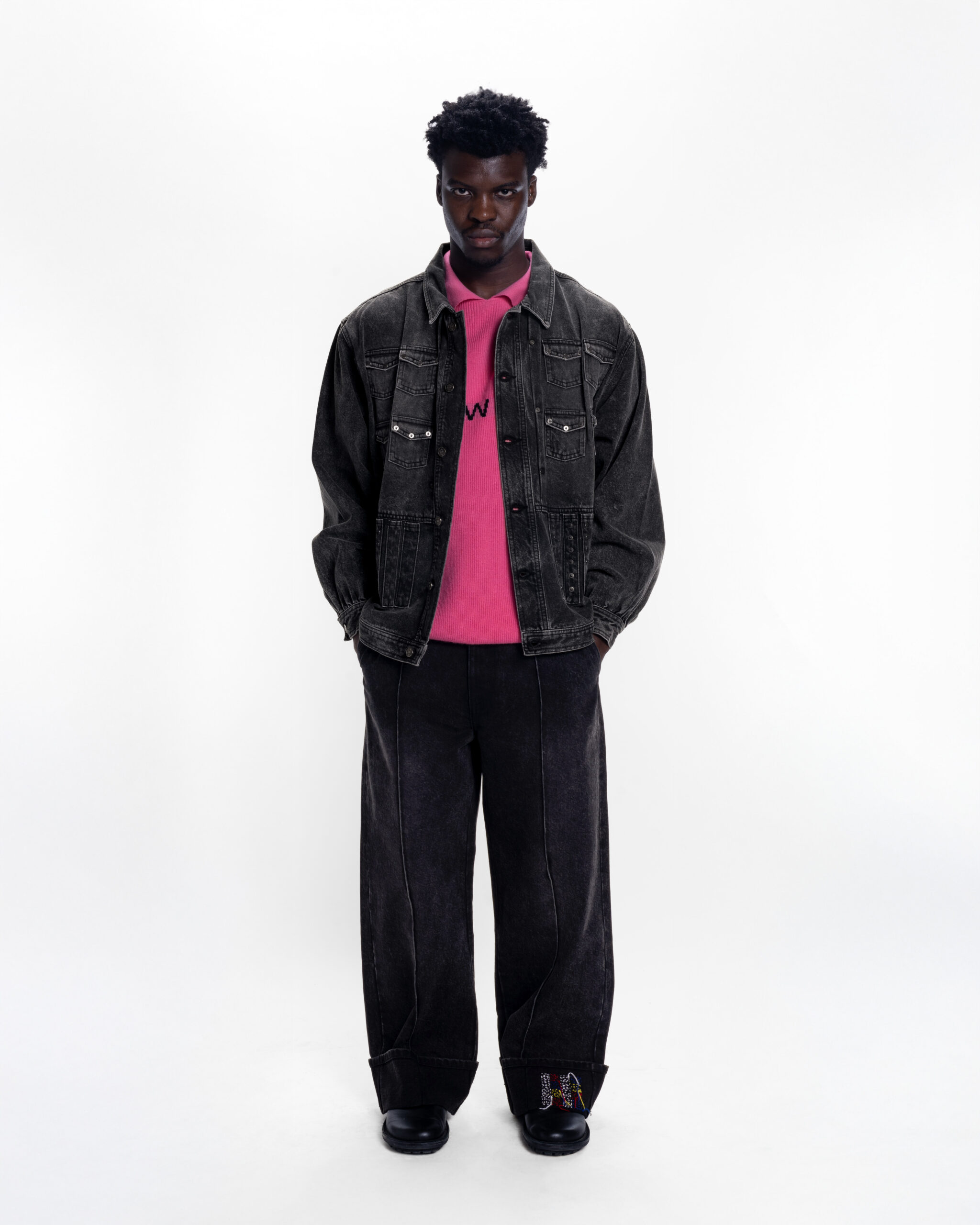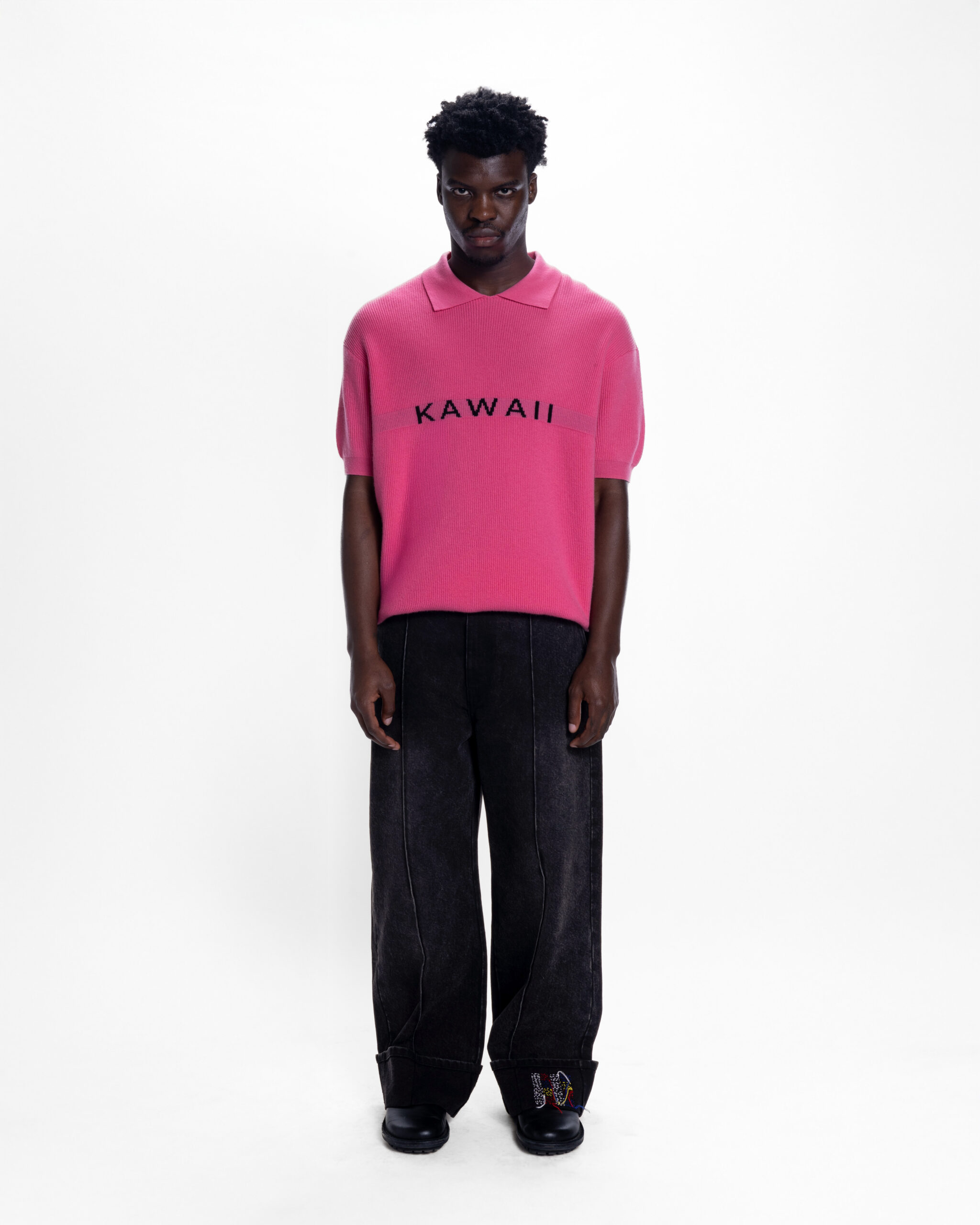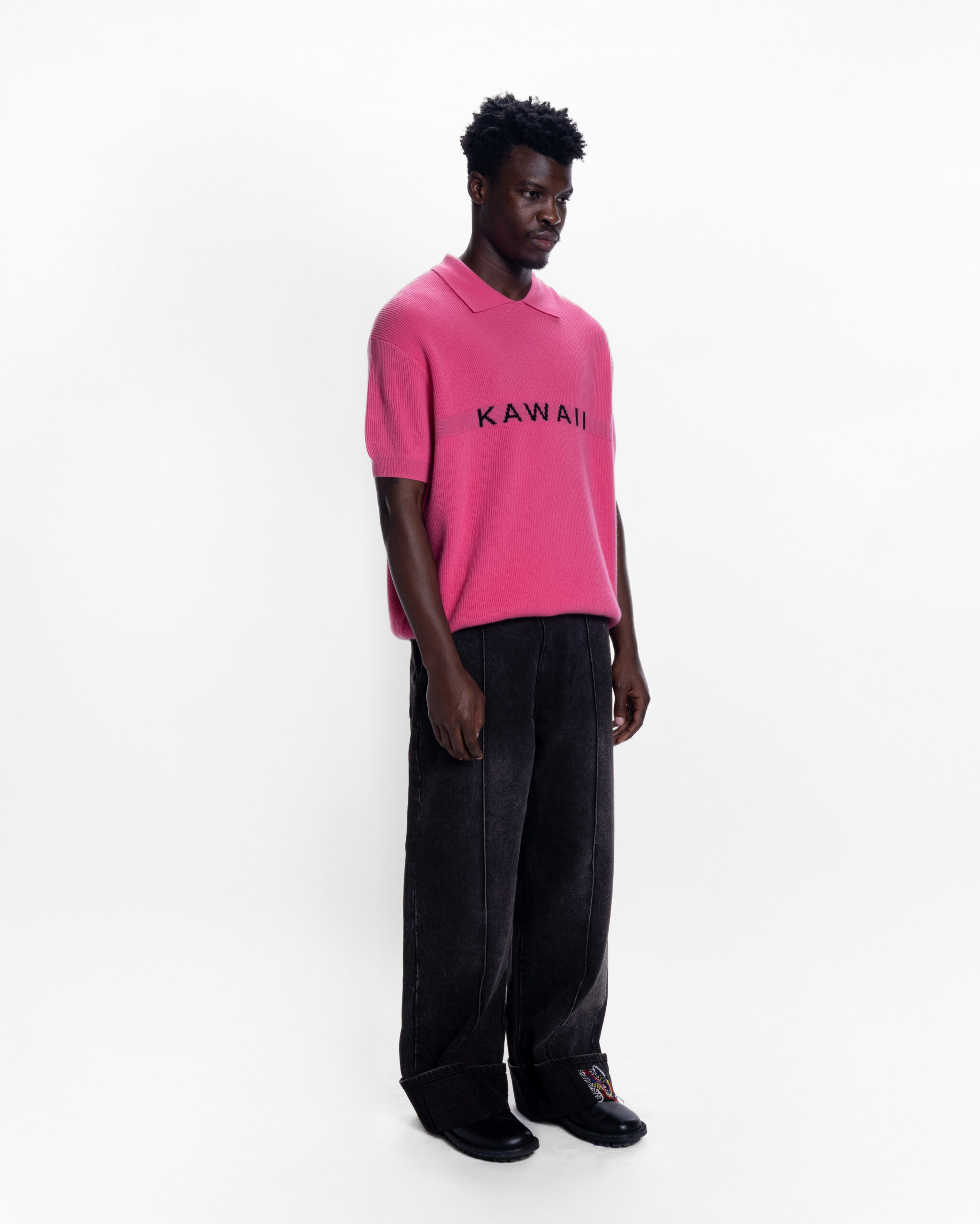 The Pink Kawaii Polo introduces a playful reinterpretation of classic knitwear. Defined by its vibrant pink hue and clean silhouette, the piece features a contrast “KAWAII” intarsia across the chest, positioned above a tonal horizontal band for subtle structure. The open collar and ribbed hem frame the relaxed shape, balancing softness with graphic precision.