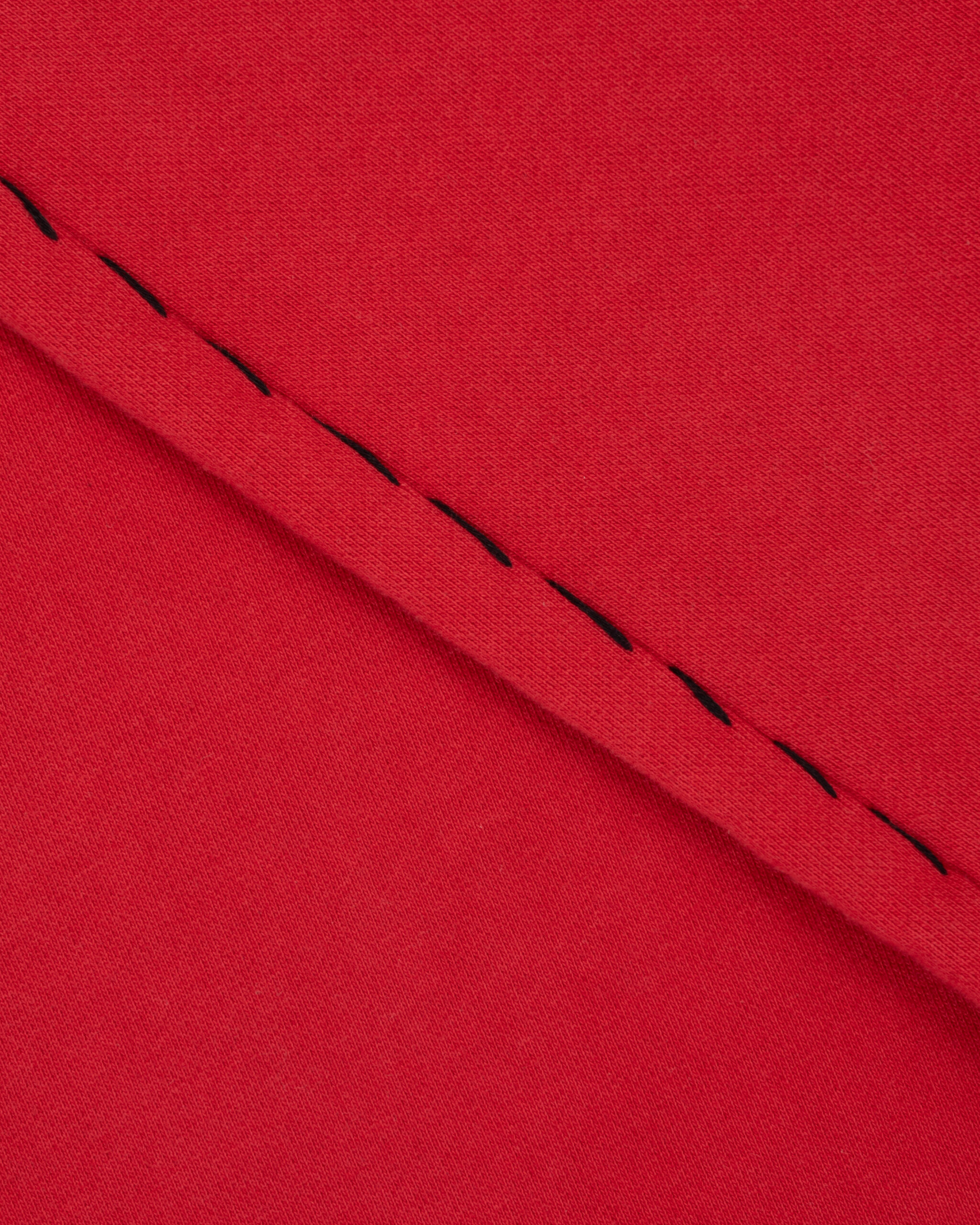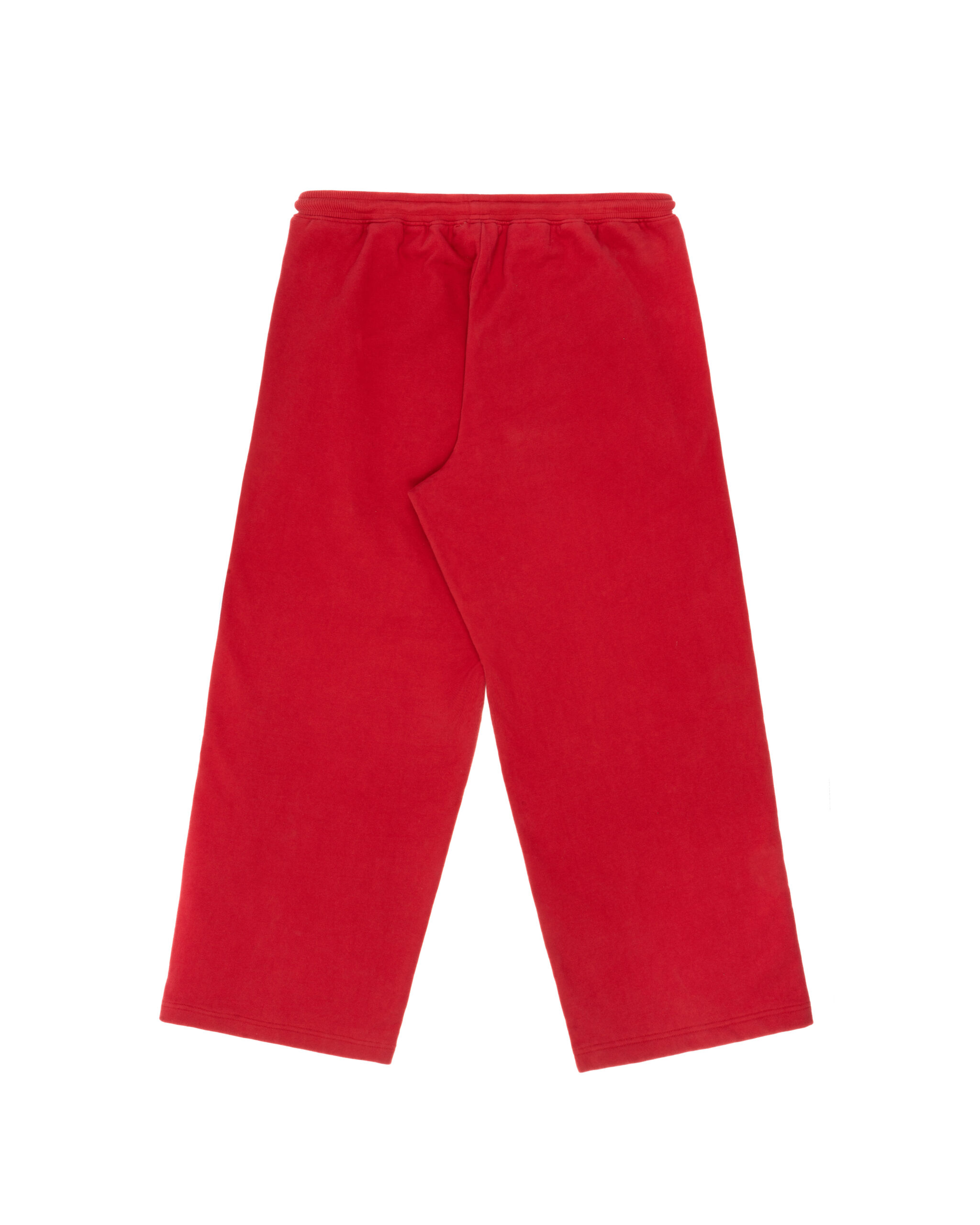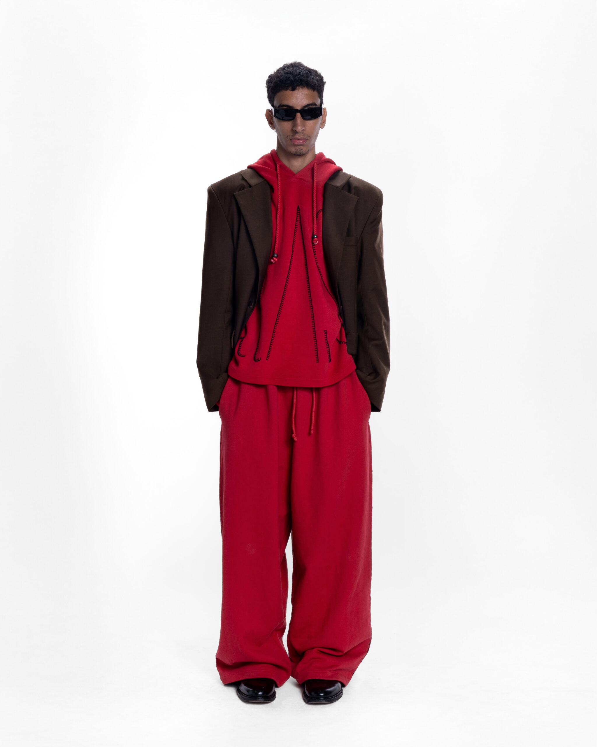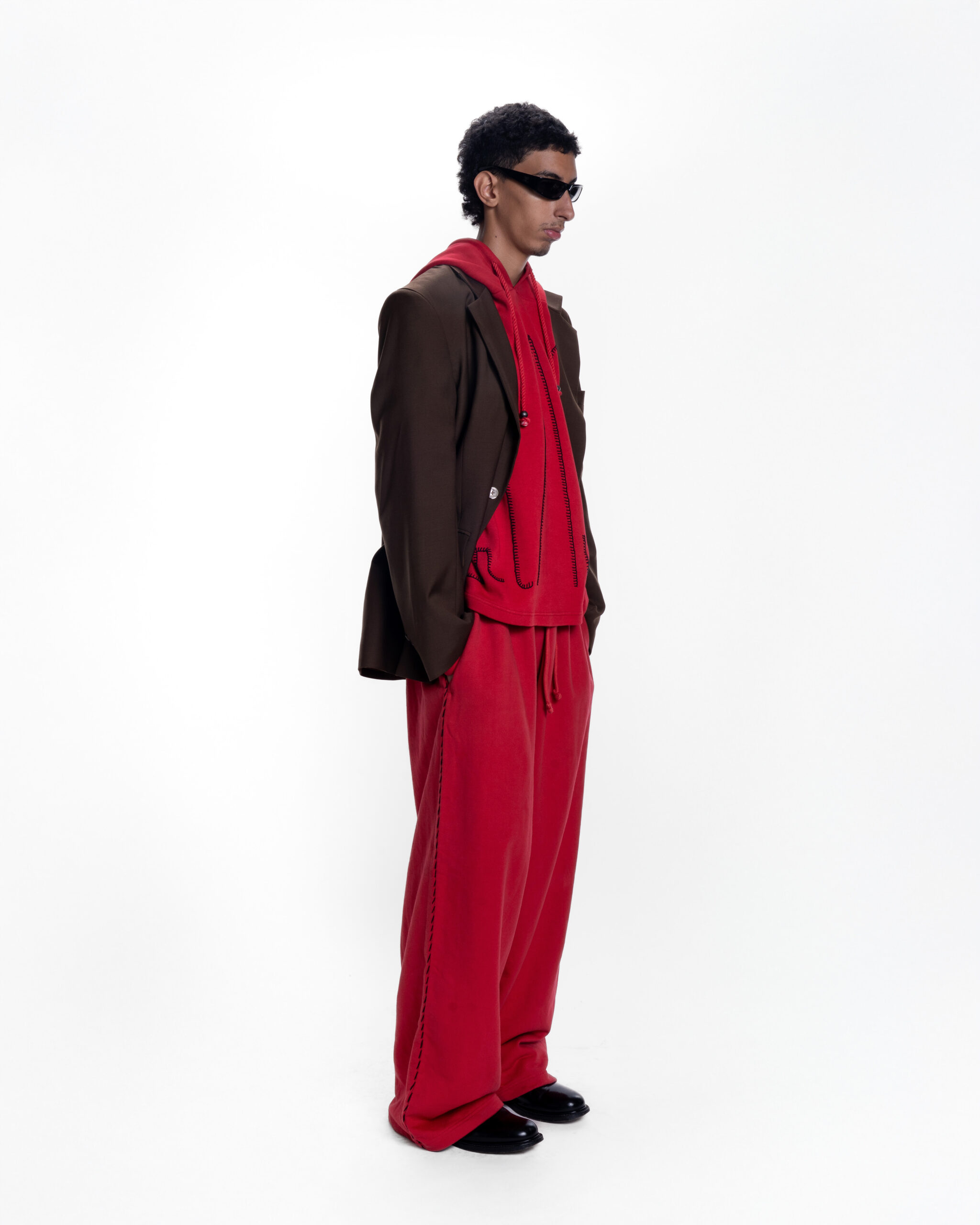 The Red French Terry Trouser merges comfort with versatility, designed for both leisure and elevated styling. Cut from soft yet substantial cotton terry, the silhouette is relaxed and straight through the leg, creating an effortless drape that adapts to any setting. Whether worn casually or paired under a structured brown blazer, the trouser balances ease and refinement with understated precision.