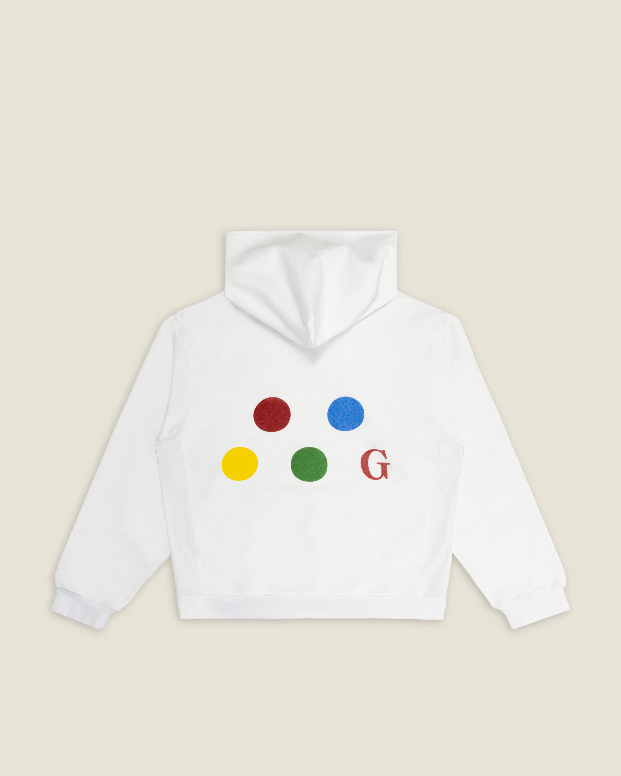 CUT IN WHITE COTTON, THIS HOODIE FEATURES RIBBED SIDE PANELS FOR SHAPE AND FLEXIBILITY. A TONAL G-DOT MOTIF SITS AT THE CHEST, WHILE THE BACK CARRIES A BOLD, MULTICOLOR INTERPRETATION. FINISHED WITH A FRONT KANGAROO POCKET AND CLASSIC RIBBED CUFFS AND HEM.