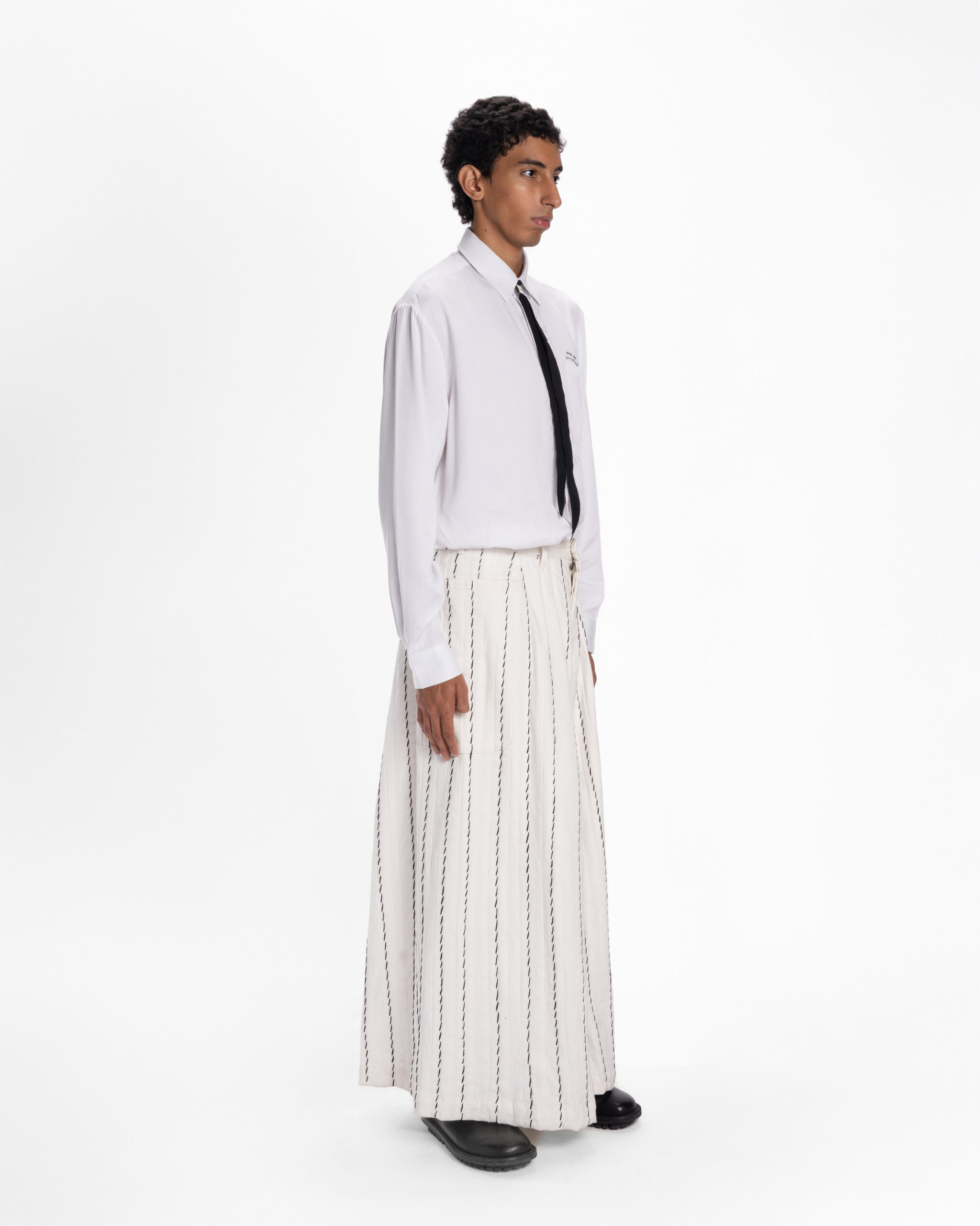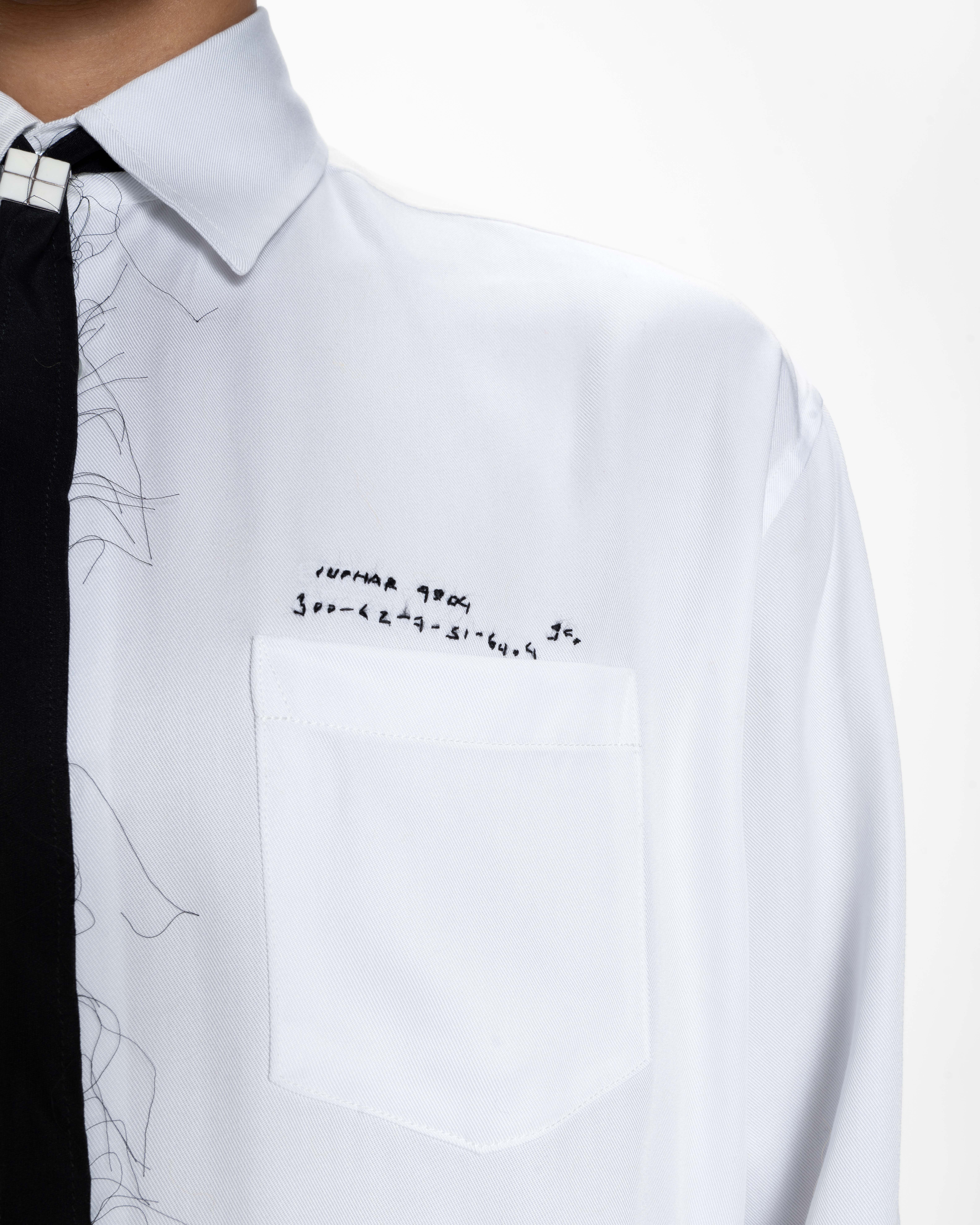 The White Pharmacy Shirt is crafted in crisp cotton and defined by intricate hand-embroidered pharmaceutical motifs. The front features subtle embroidered text at the pocket, recalling the precision of pharmaceutical labeling. These elements sit against a clean white base, allowing the embroidery to stand out while maintaining the clarity of the shirt’s tailored construction.