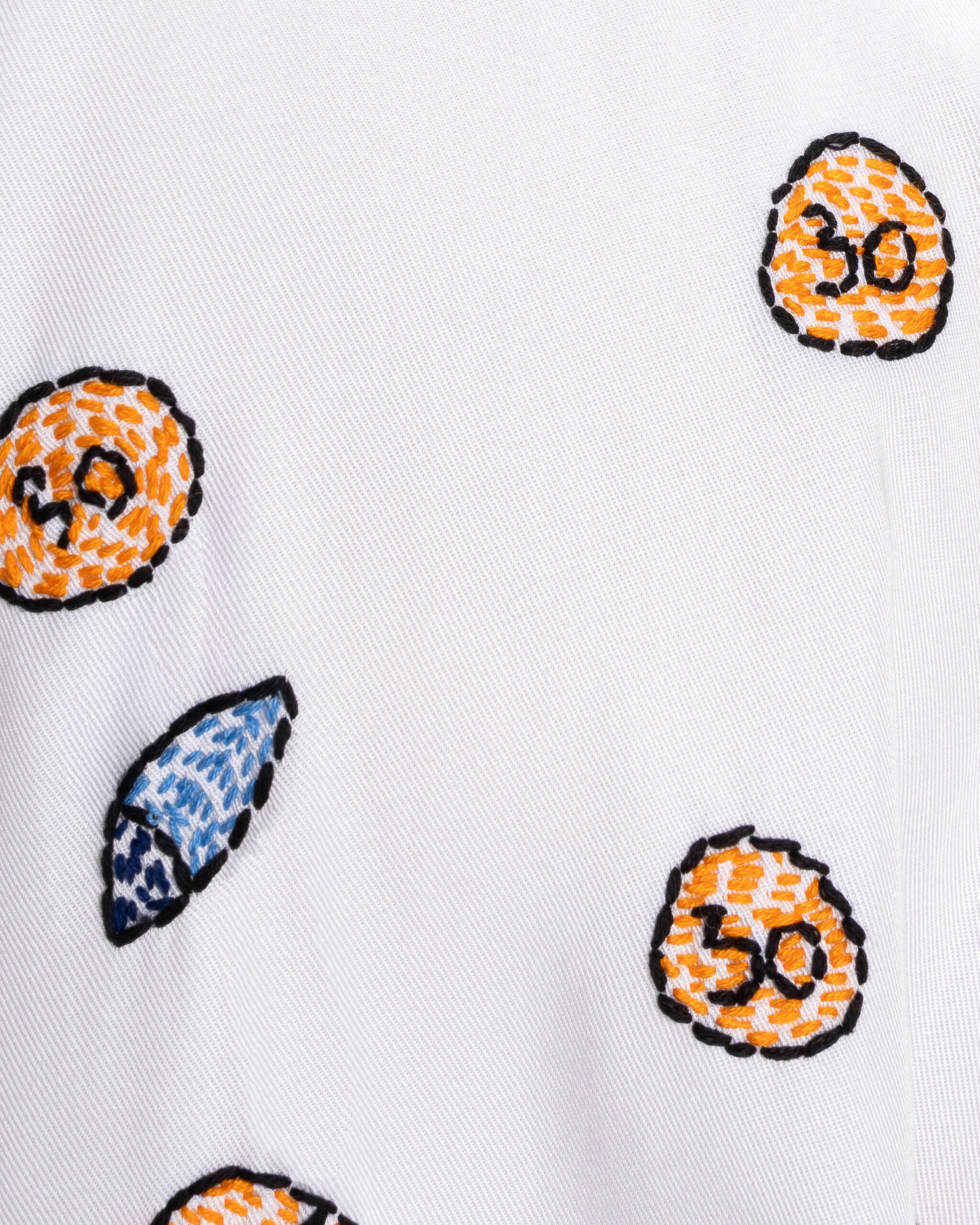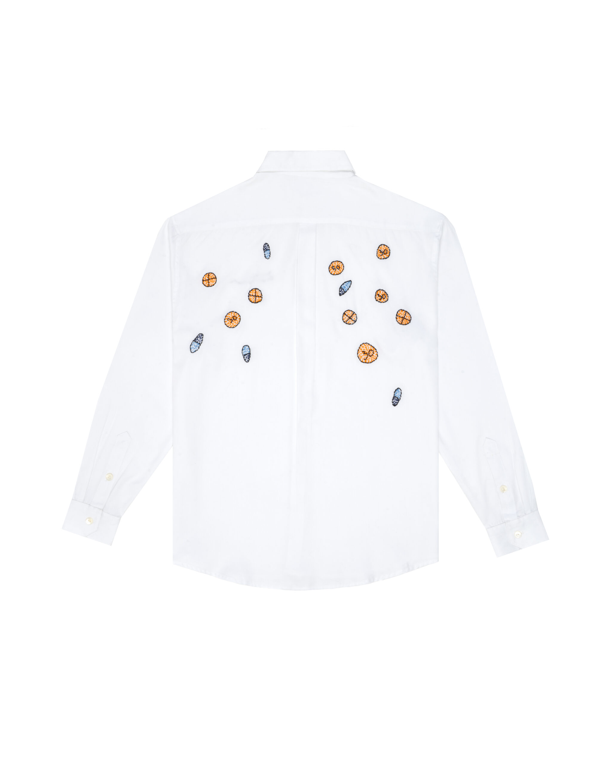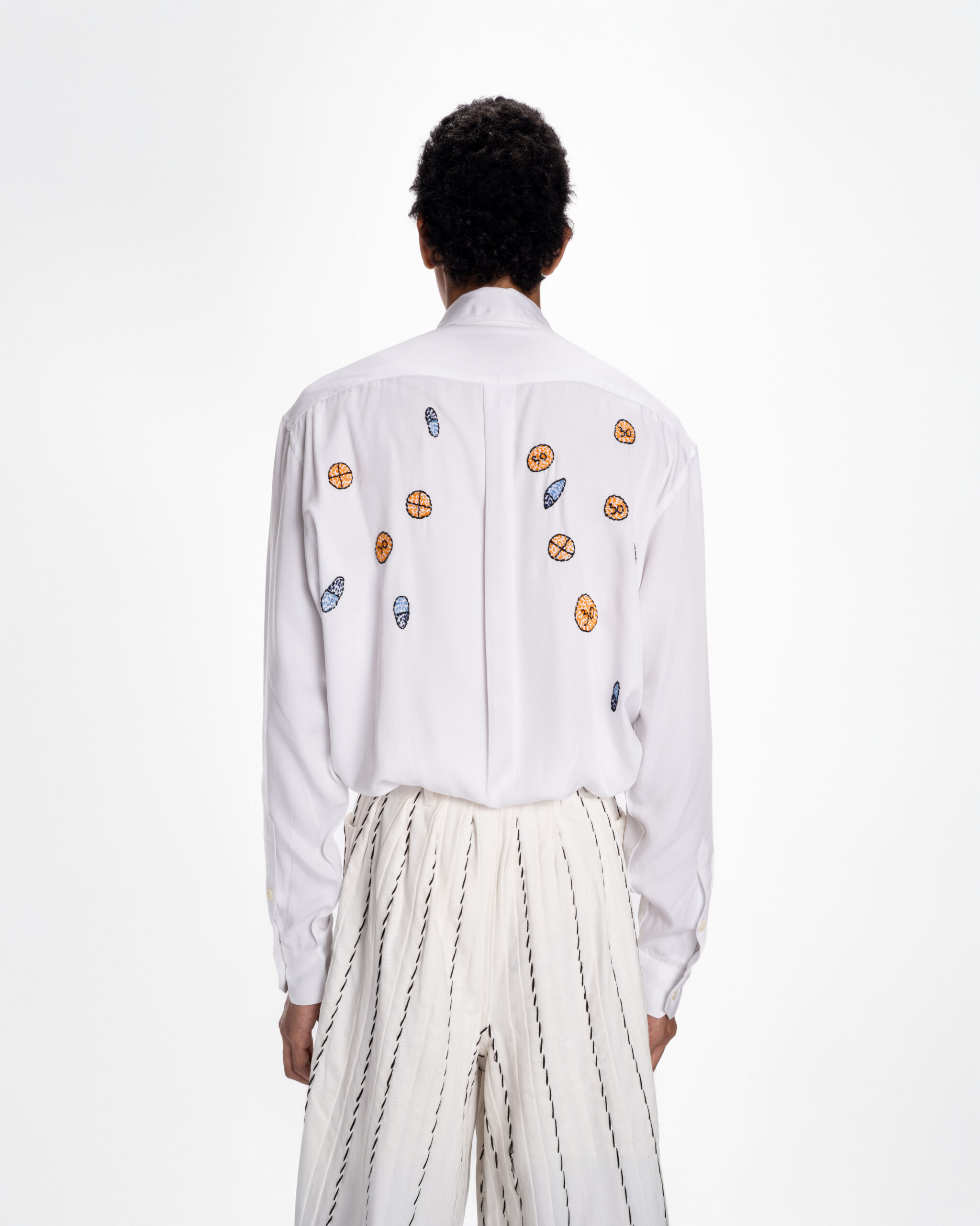 - Across the back panel, hand-embroidered capsules and tablets are scattered bringing color and movement to the design. This contrast between the shirt’s structured build and its illustrative detailing underscores the focus on craft and concept. Cut to a standard fit, the piece highlights careful embroidery work while retaining the straightforward wearability of a classic button-down.