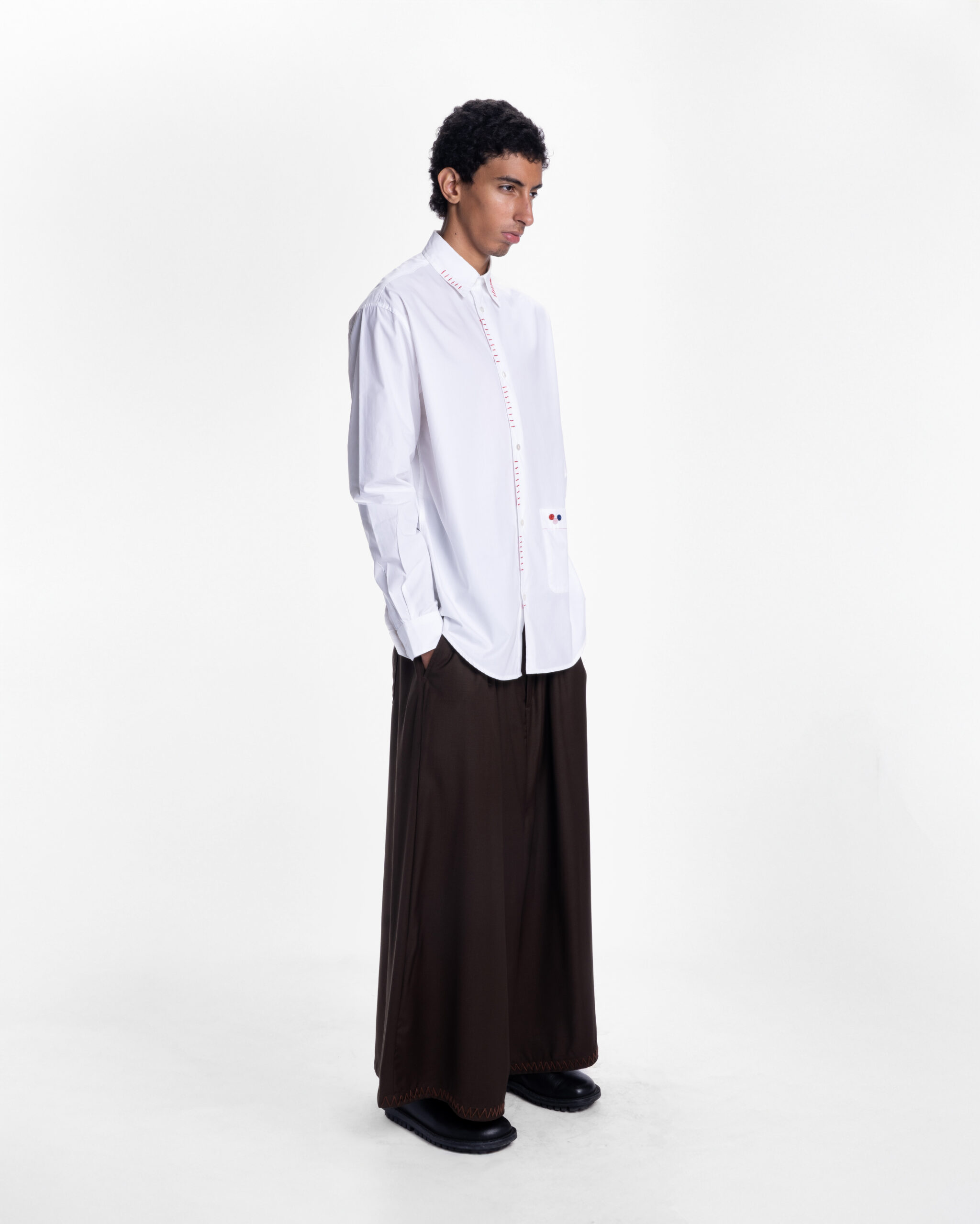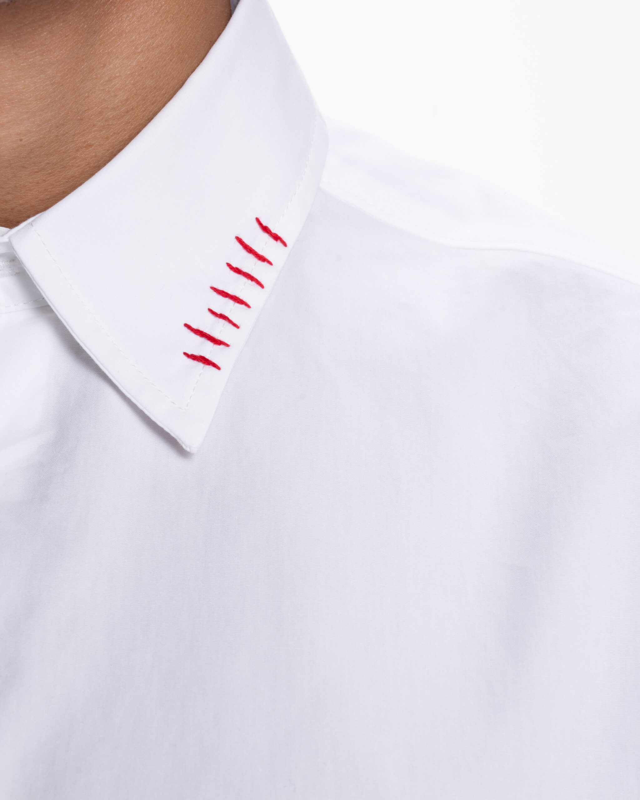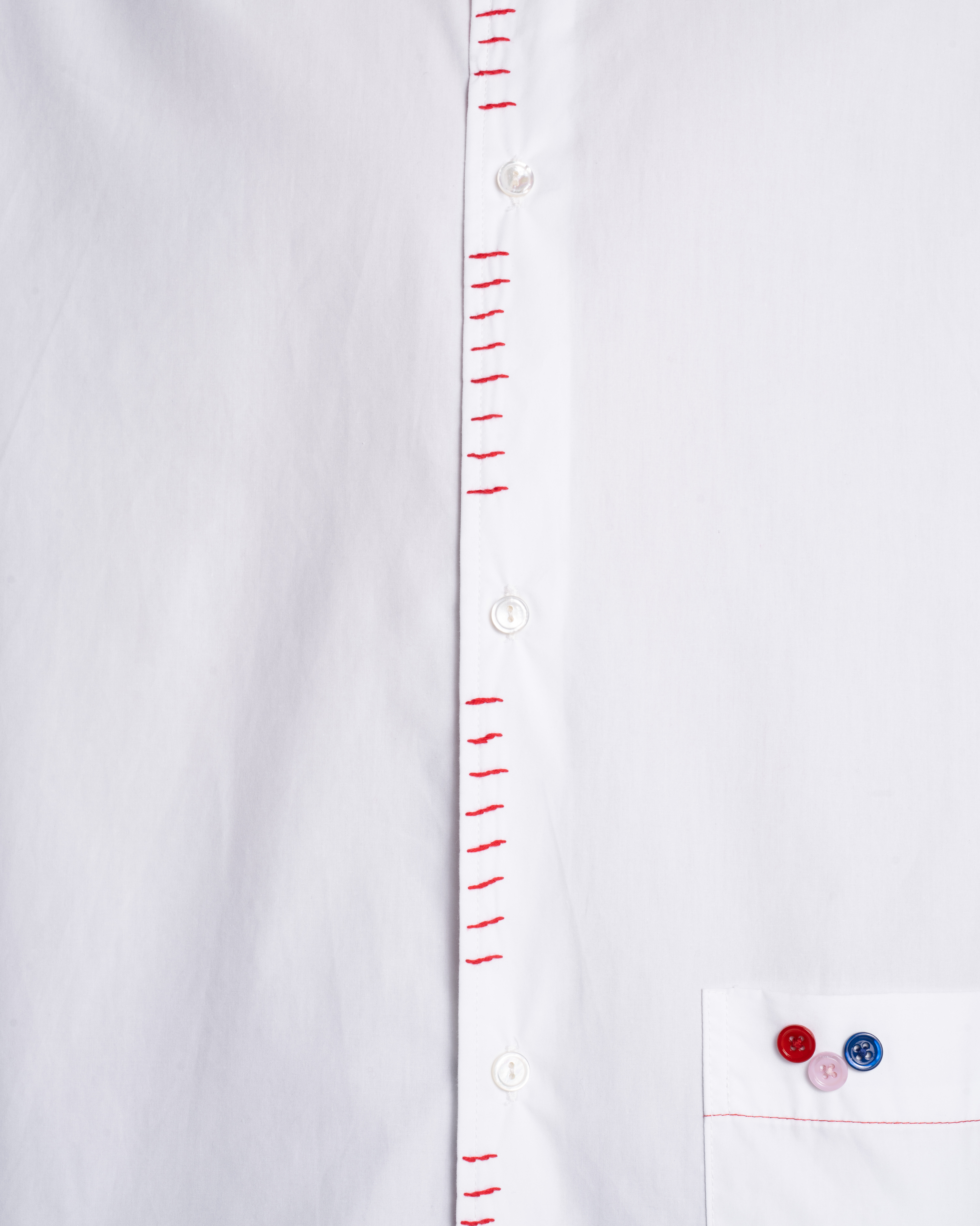 The White Lines Shirt is cut from crisp white cotton and elevated through intricate hand-embroidery. Red stitchwork runs along the placket and collar, introducing a linear element that breaks the clean surface with measured rhythm. At the chest pocket, three contrast buttons in red, pink, and blue add a subtle but deliberate point of variation, reinforcing the focus on crafted detail.