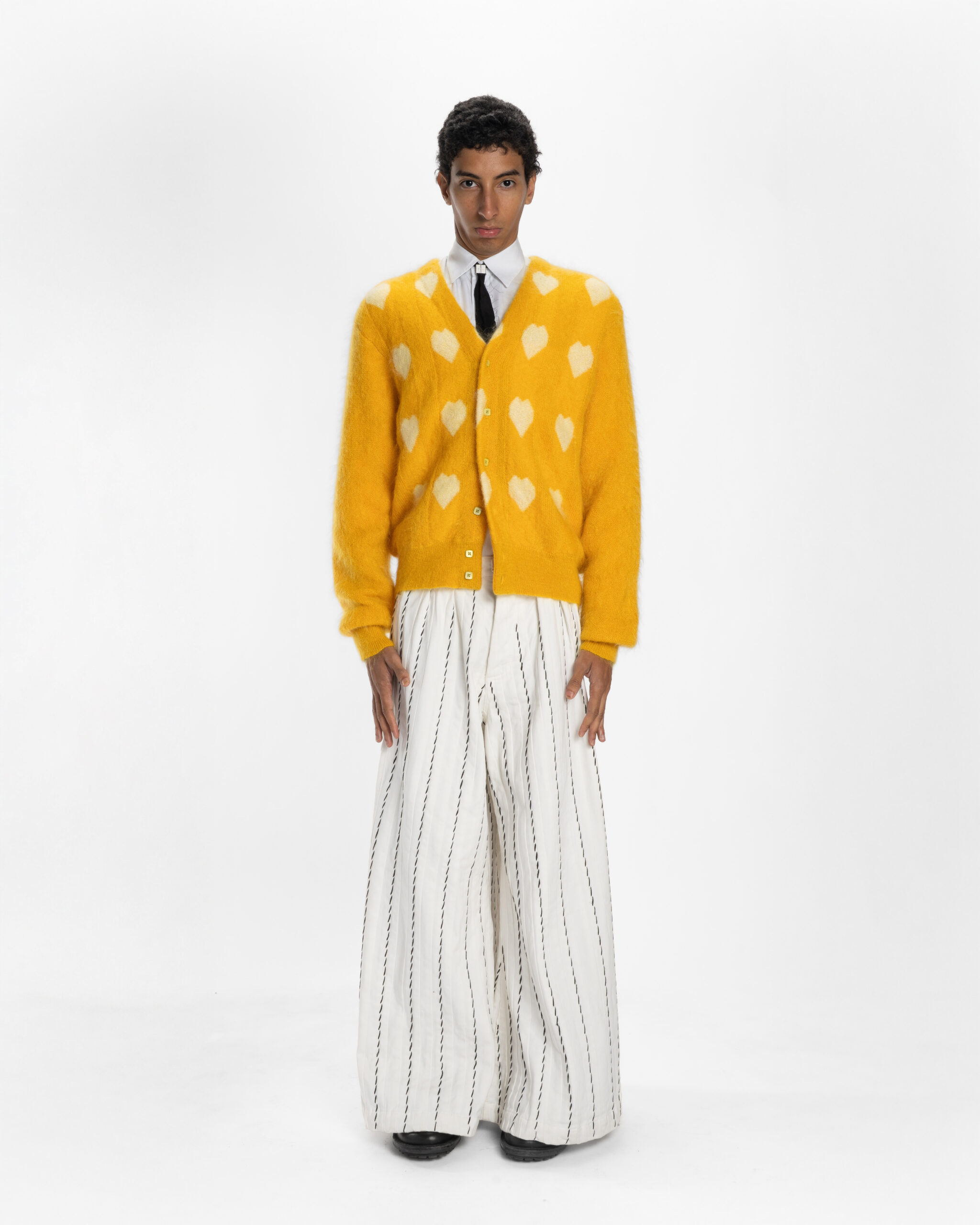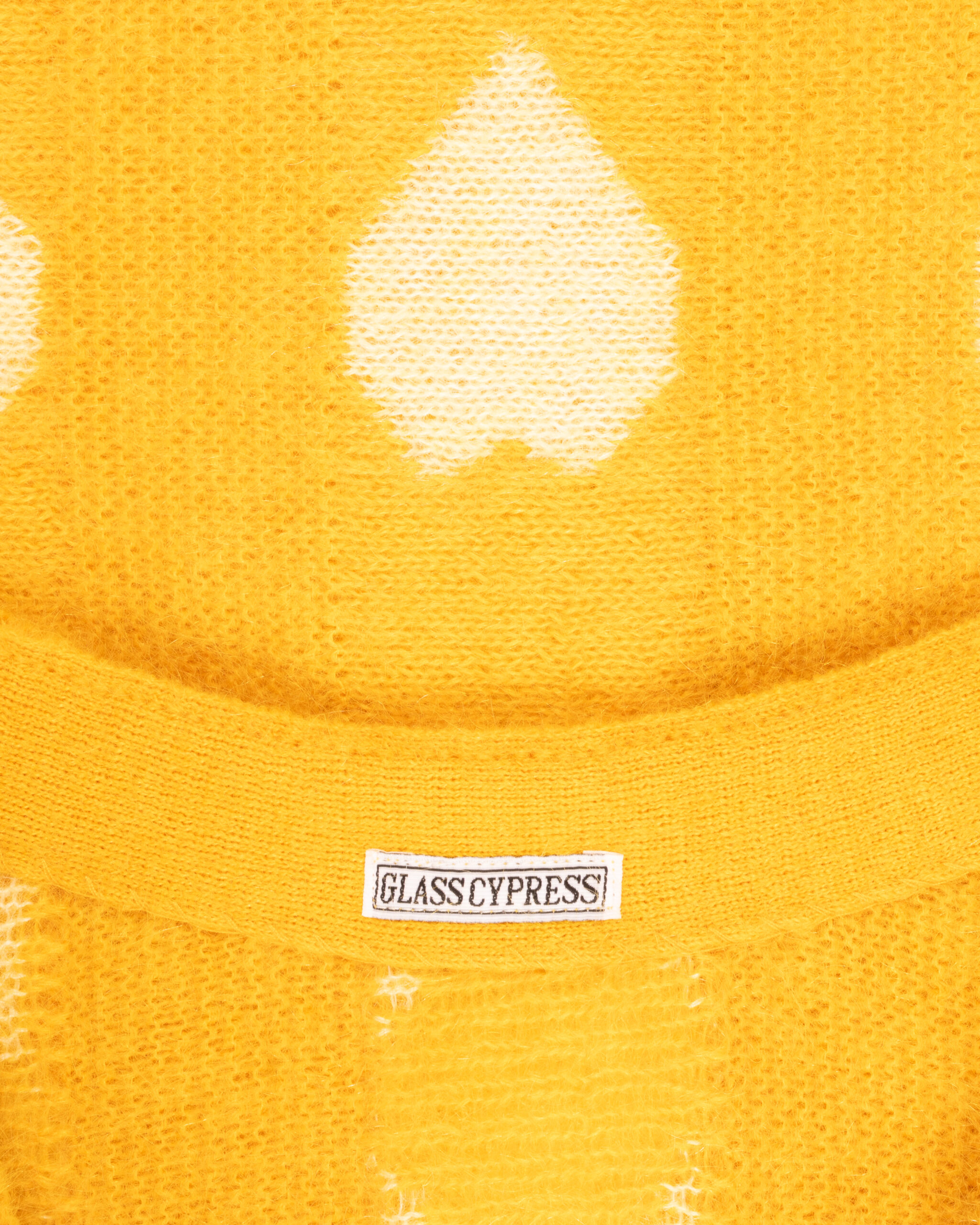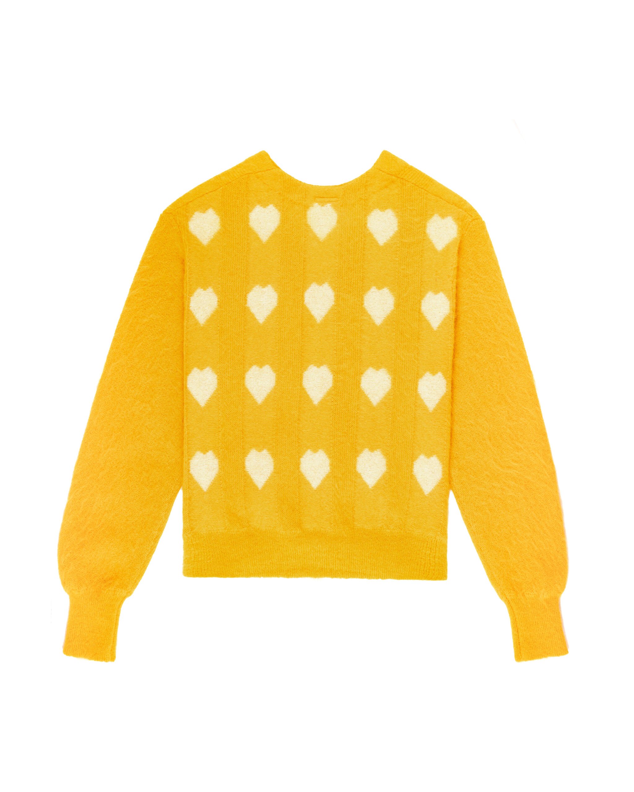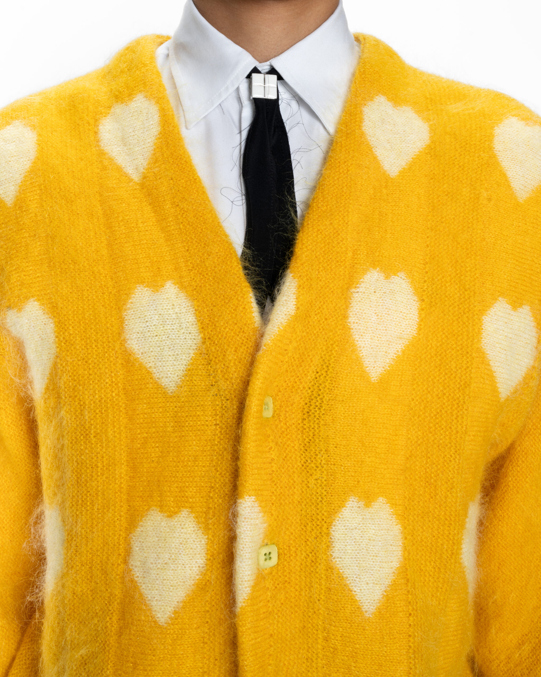 Oversized cardigan knit from a brushed mohair blend in a saturated yellow tone. Features intarsia-knit ivory heart motifs repeated across the front and back. The silhouette is relaxed, with dropped shoulders, a slightly extended body, and soft structure throughout. Finished with tonal button closure and ribbed cuffs.